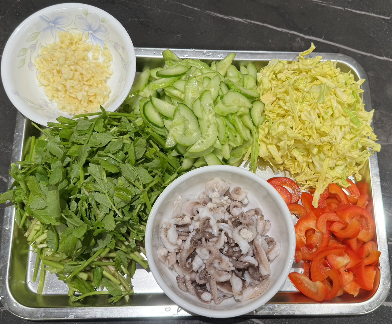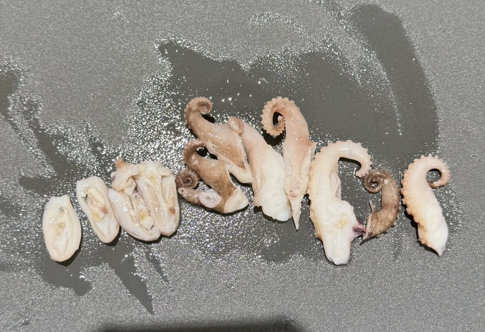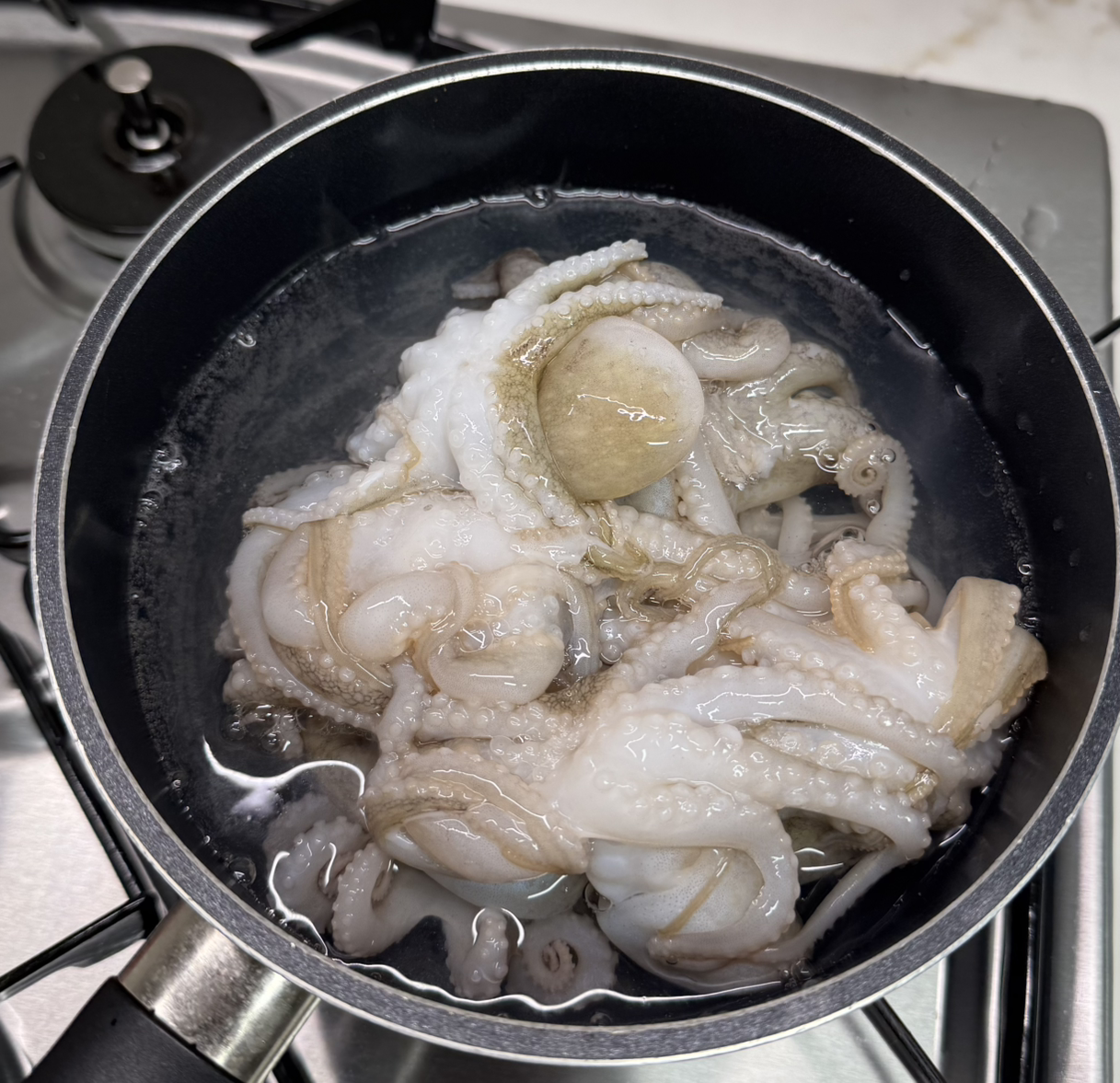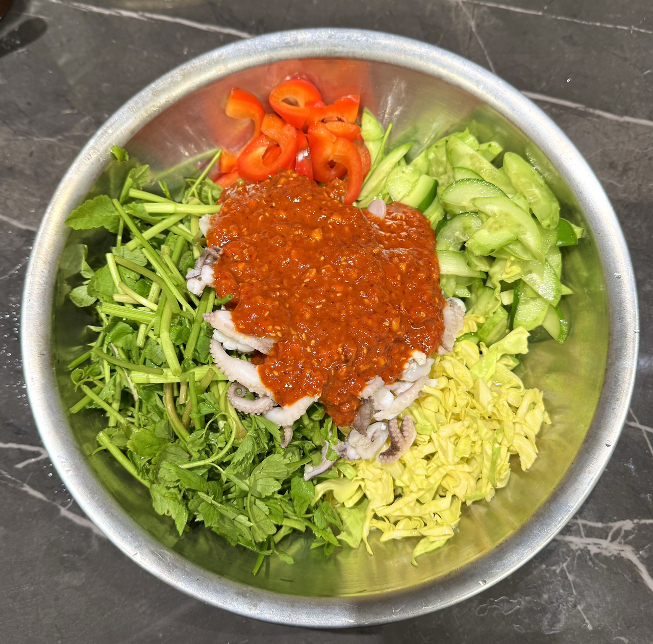 쭈꾸미는 익혀서 맛을 보았는데 질겅한 느낌이 덜 익은 것 같아서 한번 더 충분히 익혀줬다. 냉동된 쭈꾸미를 사용하는 것이기 때문에 충분히 익혀 찬물로 헹궈뒀다. 오징어를 사용해도 괜찮지만, 익혔을 때 오징어보다 연해서 치아가 안 좋으신 분은 쭈꾸미를 사용하는 게 좋다.