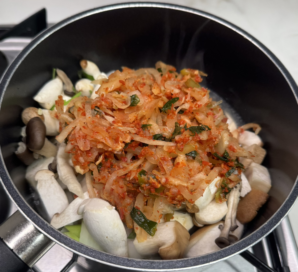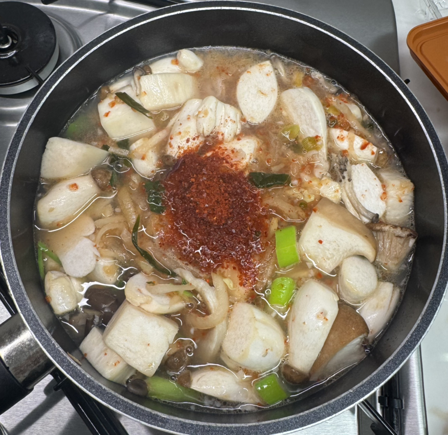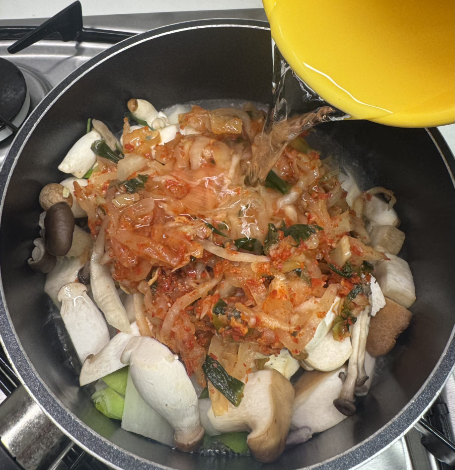 요리에 쓰다가 남은 느타리버섯, 새송이버섯, 작은 새송이버섯등을 듬뿍 넣어줬다. 버섯은 내 소울푸드 중 하나인데 단백질이 풍부하고 익었을 때 채즙이 달아서 이곳저곳에 자주 넣는다.