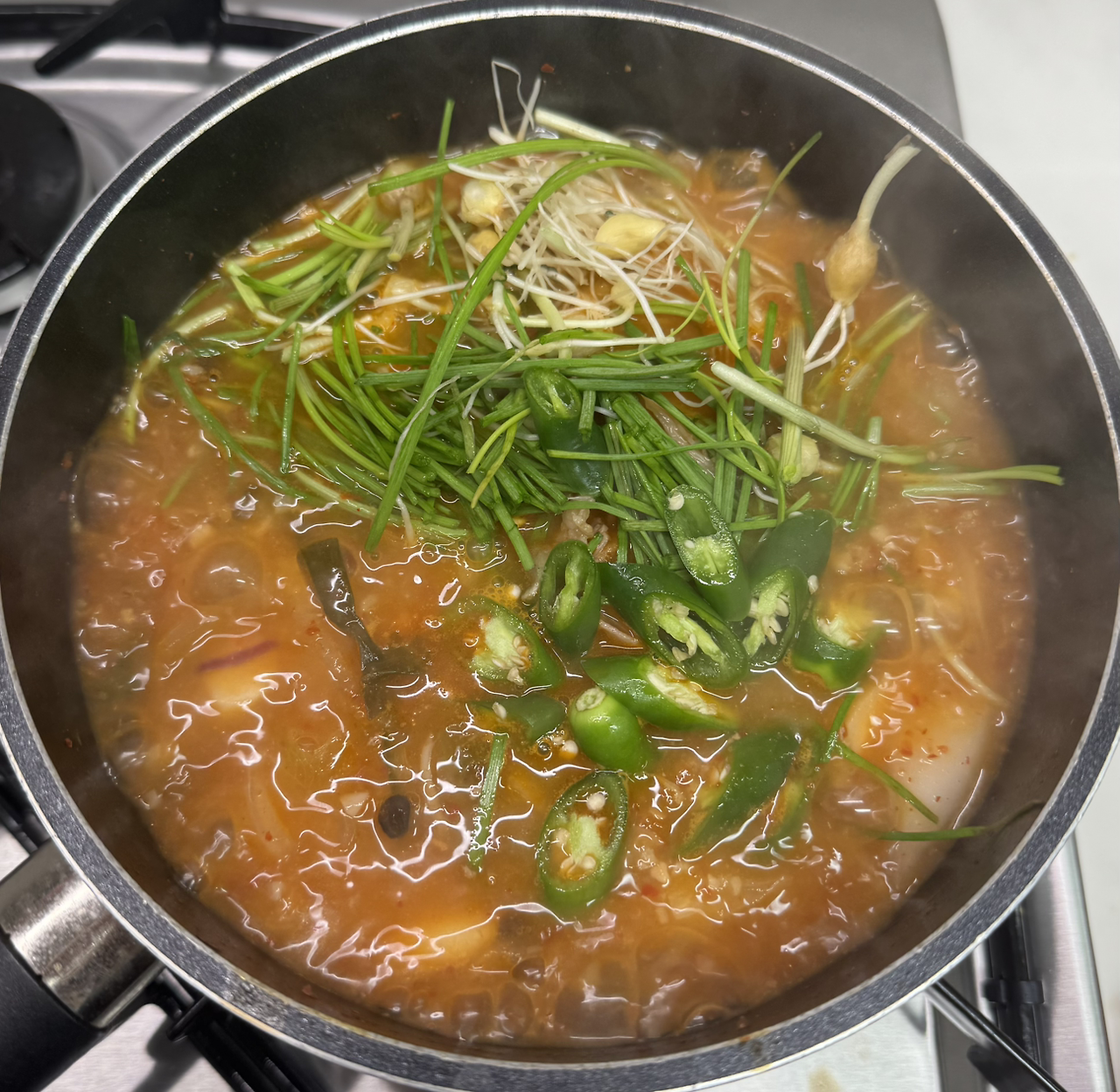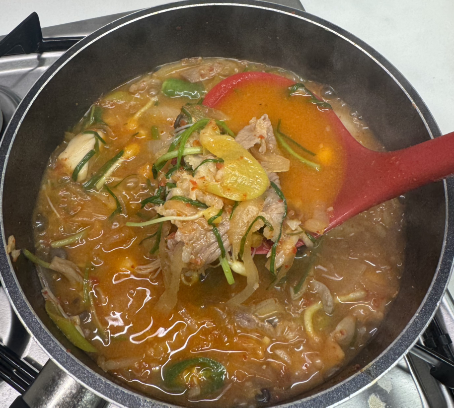 달래를 넣고 청양고추(남편의 기호)를 넣으니 완성되었다. 가끔 채소를 가득 넣은 찌개나 국은 70% 정도 끓인 후 불을 끄고 잔열에 익게 하면, 가스비도 절약하고 재료가 천천히 익으면서 국물이 배어들어 맛이 좋다.