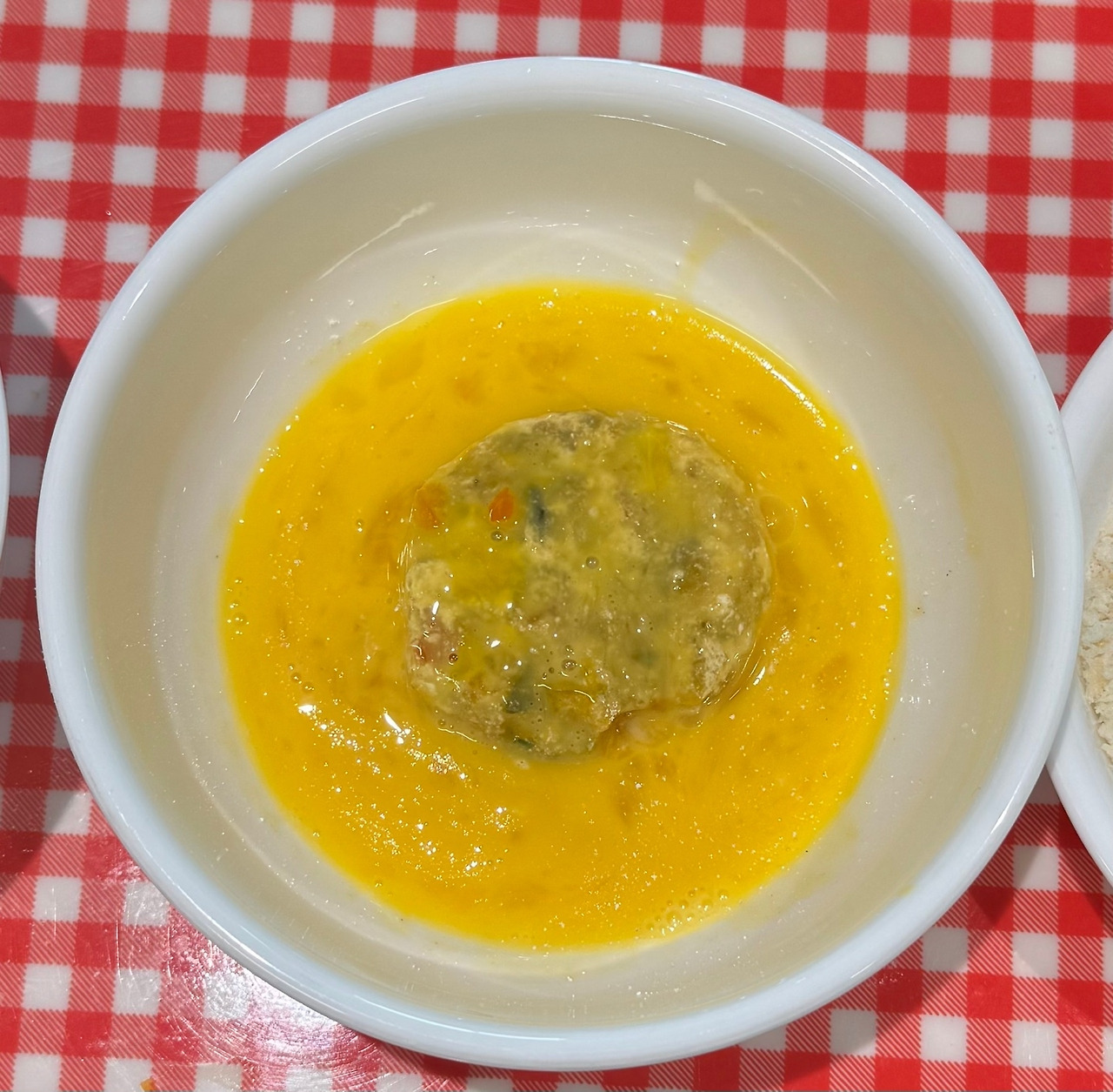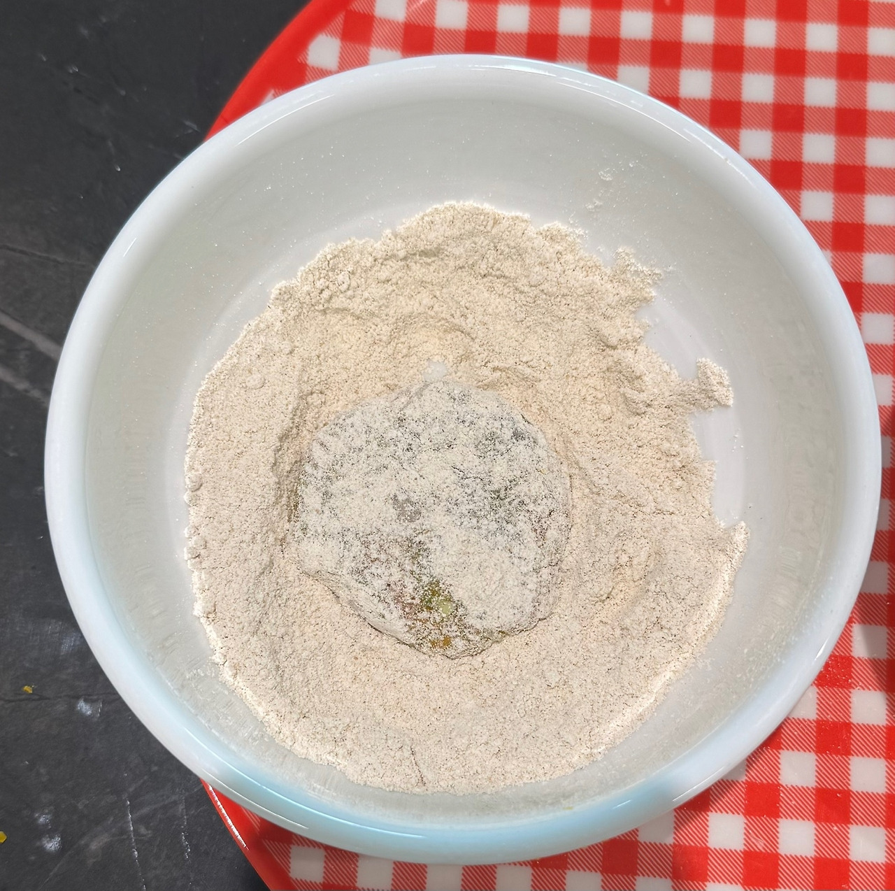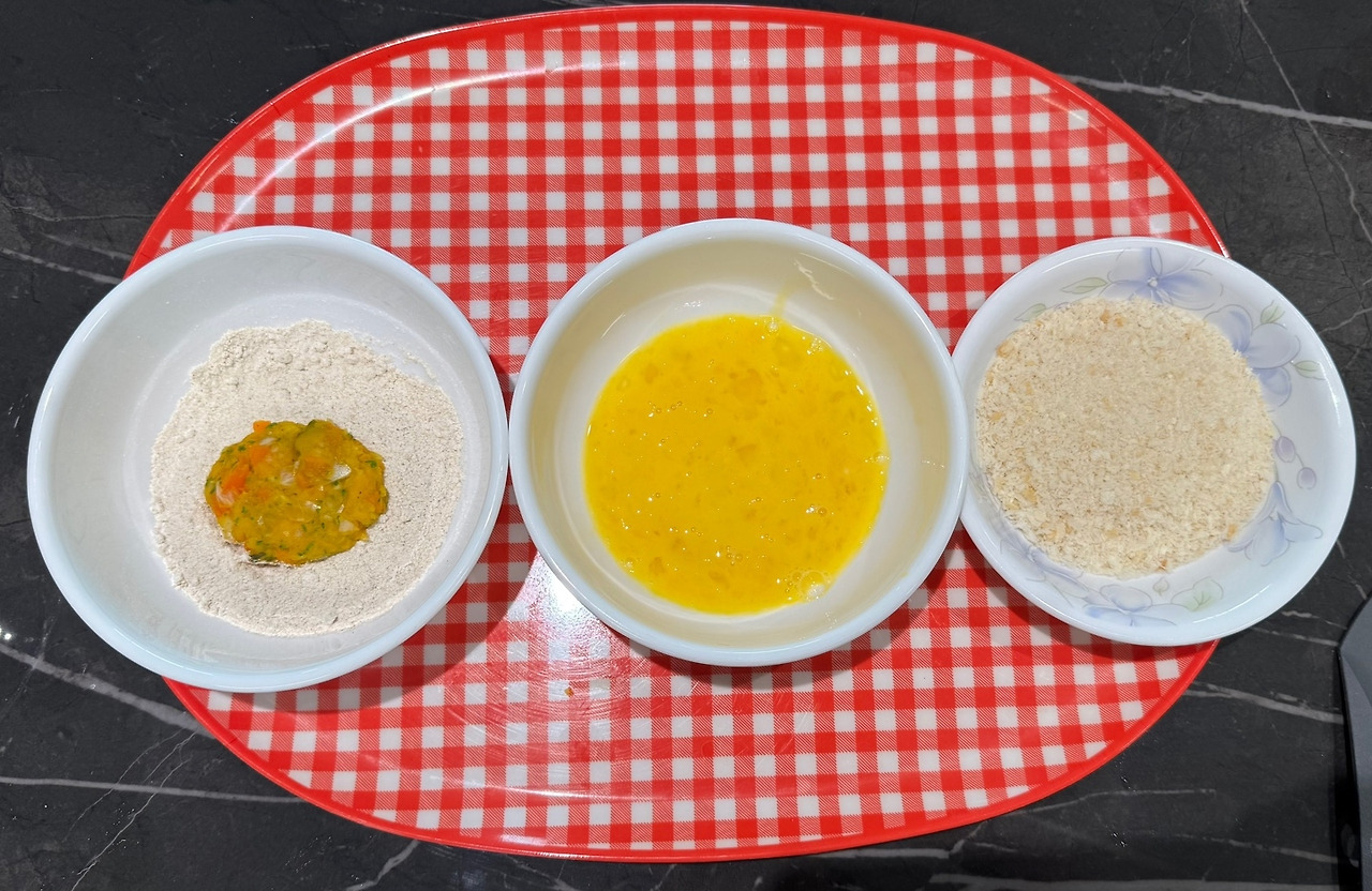 책에서는 밀가루와 함께 빵가루를 입히라고 나와있지만 보리가루가 있어 보리가루를 준비해 줬다. 가루옷을 입힐 때, 먼저 완자에 보리가루(또는 밀가루)를 모두 입혀놓은 다음 계란물과 빵가루를 입히면 손에 많이 안 묻어 편하게 가루옷을 입힐 수 있다.