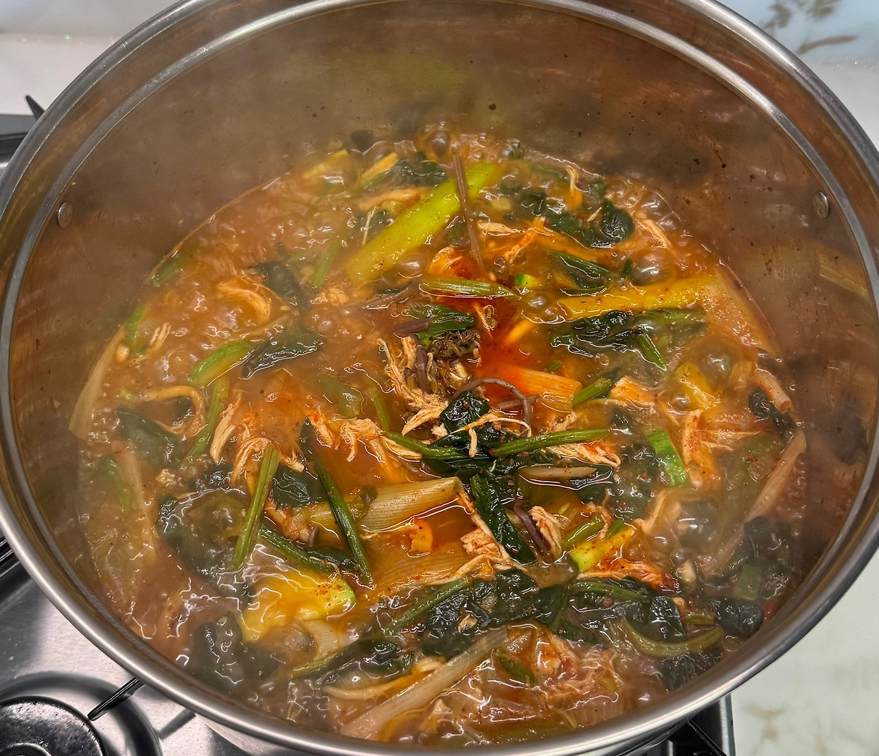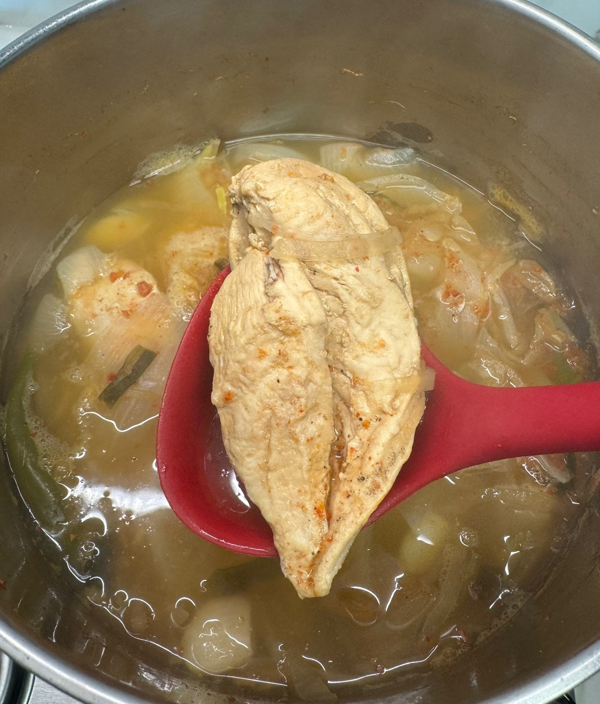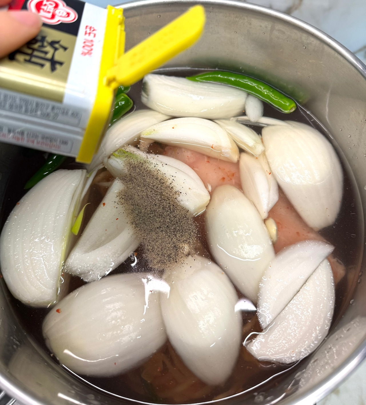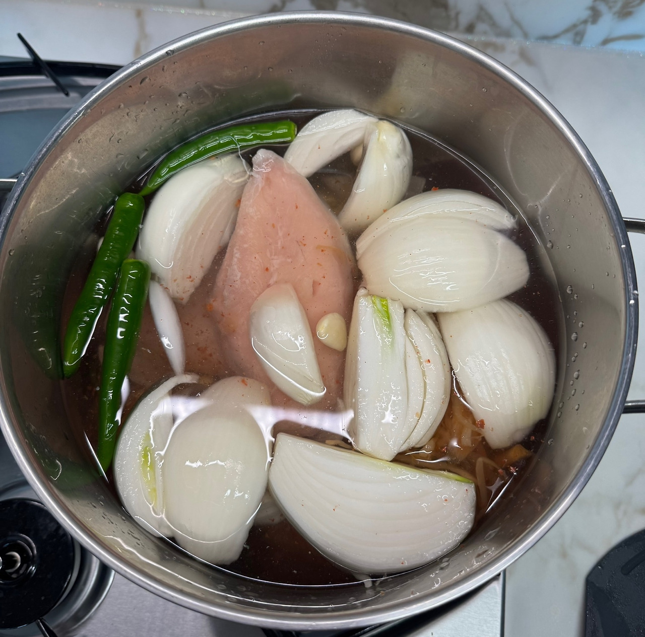 먼저 육수를 끓여준다. 물을 넉넉히 받아 청양고추 3개, 닭, 마늘, 생강, 김칫소, 양파, 소금, 후추를 넣고 센 불로 끓이다가 중 약불로 1시간 이상 끓여준다. 오래 끓이는 이유는 육질이 부드러워지고 닭육수와 채소육수가 충분히 우러나올수록 육수맛이 깊기 때문이다.