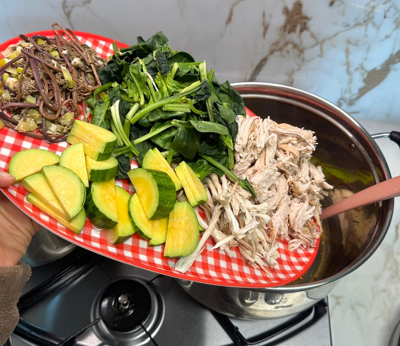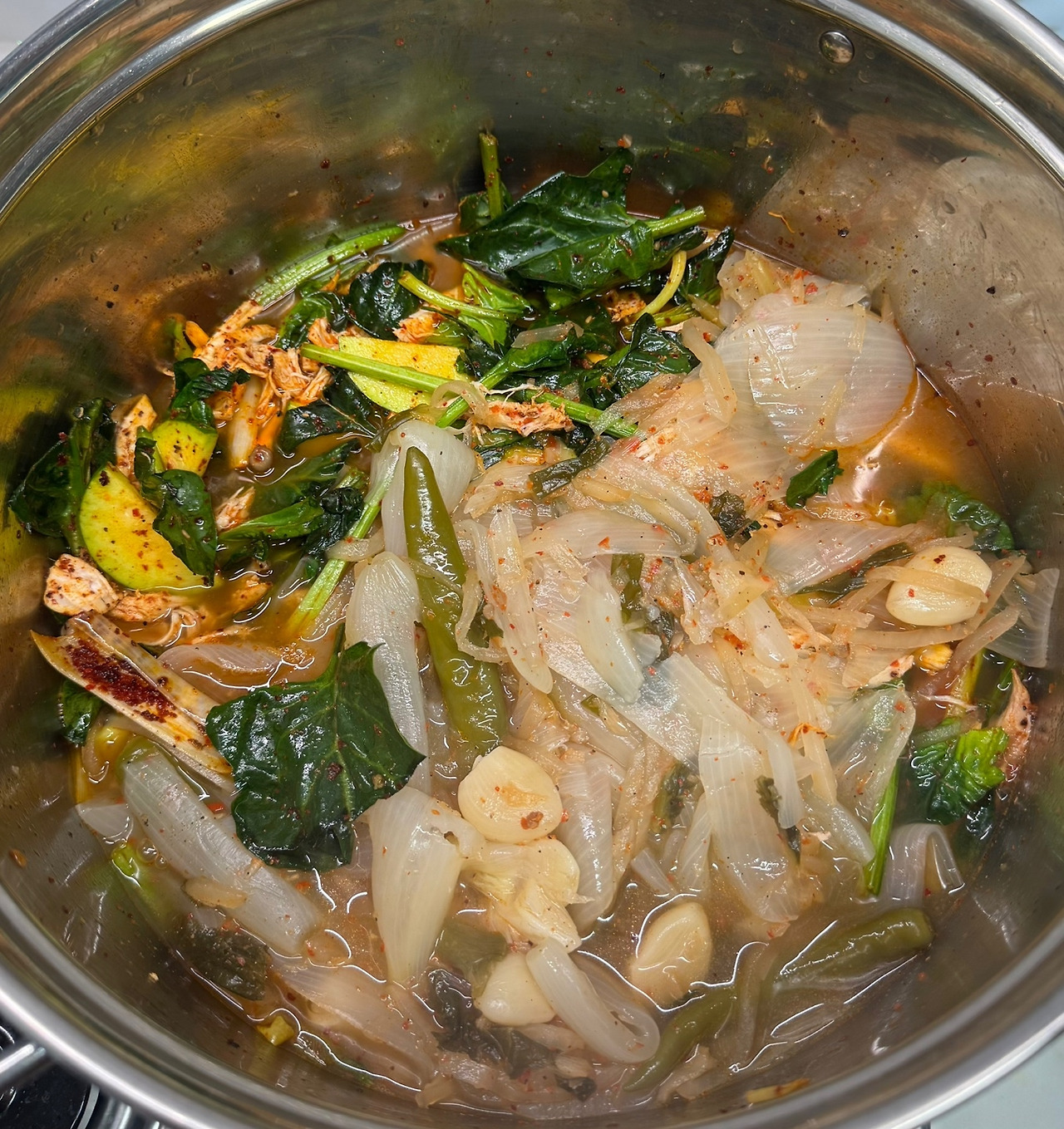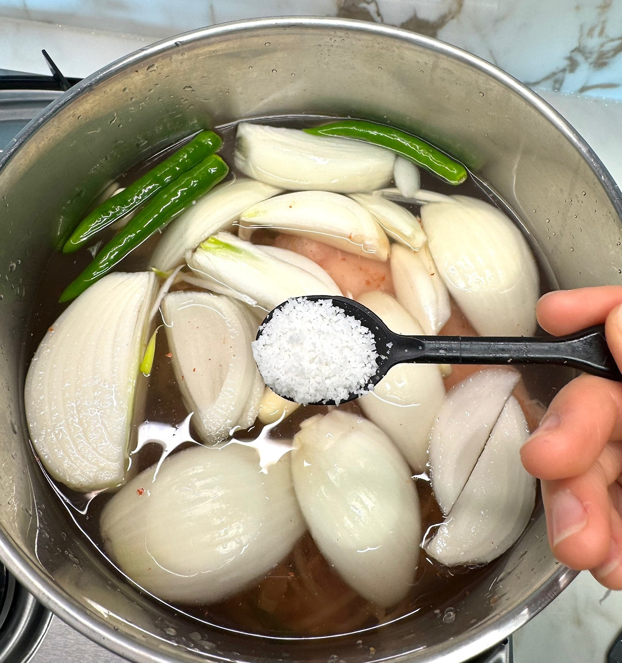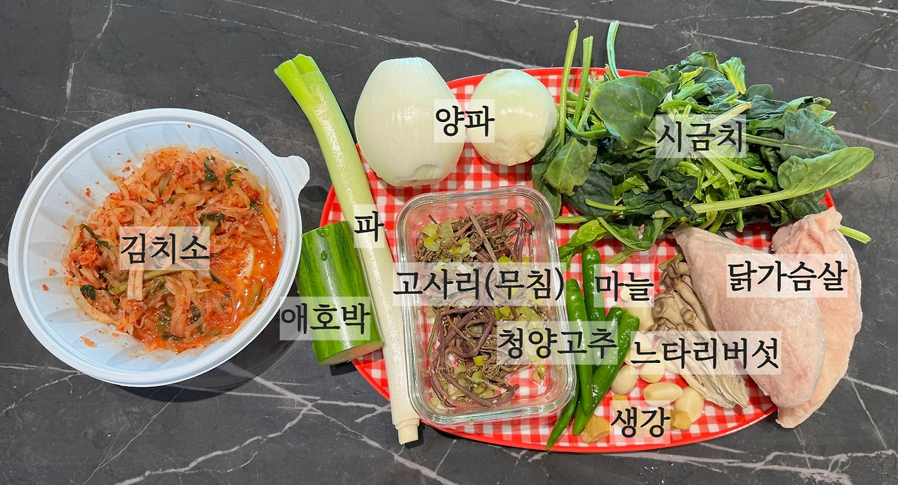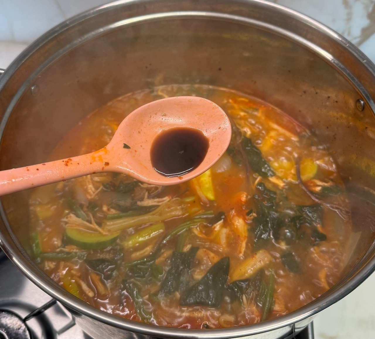 먼저 육수를 끓여준다. 물을 넉넉히 받아 청양고추 3개, 닭, 마늘, 생강, 김칫소, 양파, 소금, 후추를 넣고 센 불로 끓이다가 중 약불로 1시간 이상 끓여준다. 오래 끓이는 이유는 육질이 부드러워지고 닭육수와 채소육수가 충분히 우러나올수록 육수맛이 깊기 때문이다.