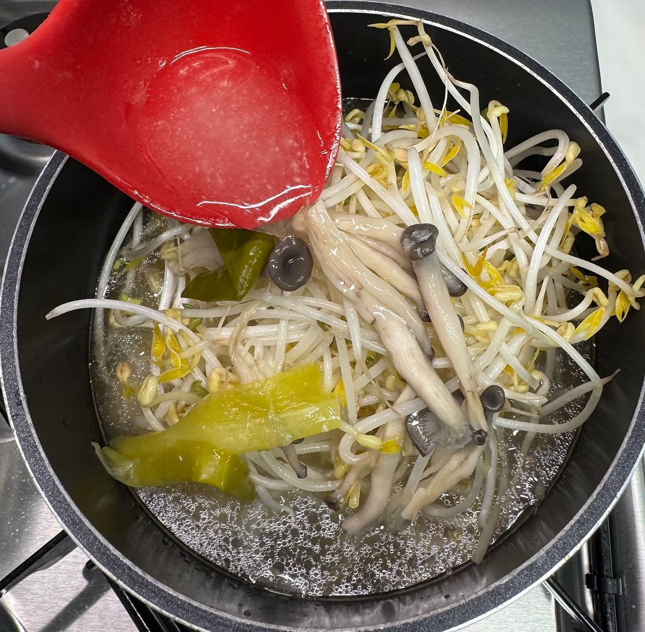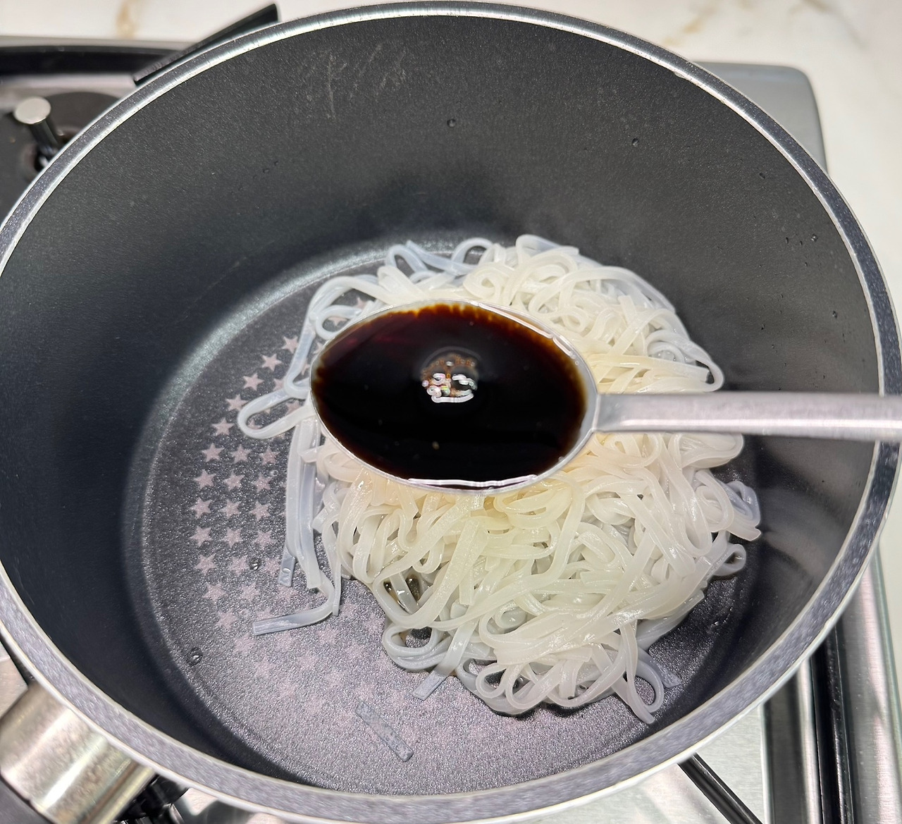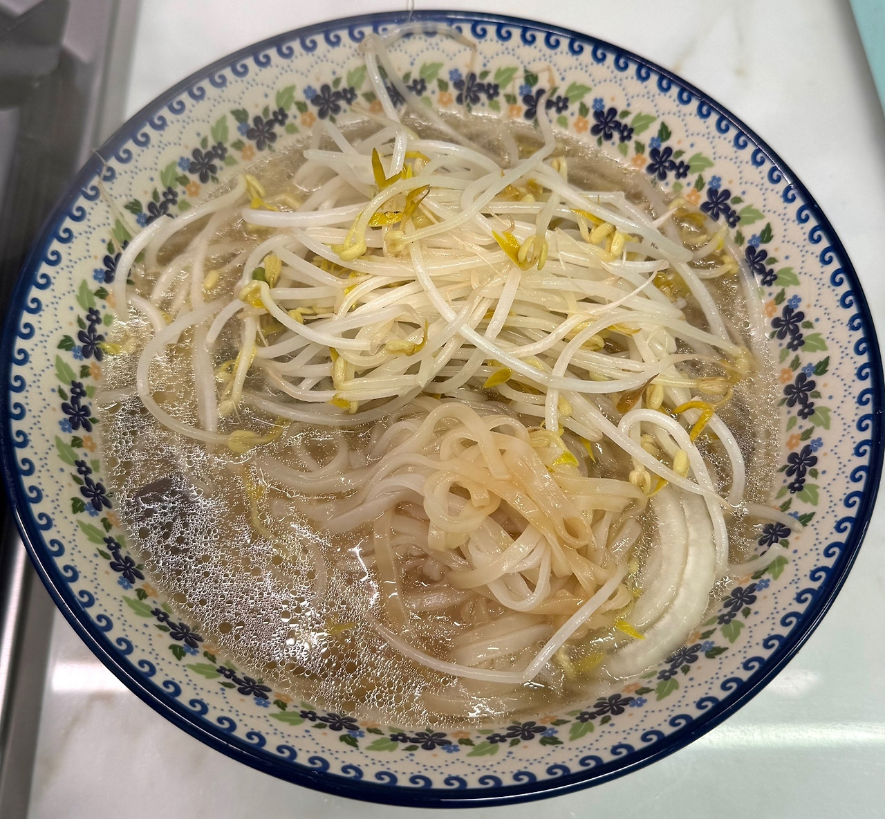 냄비에 닭육수, 쌀국수, 양파, 숙주나물, 진간장 1, 참치액젓 1 넣고 3분 끓여준다.