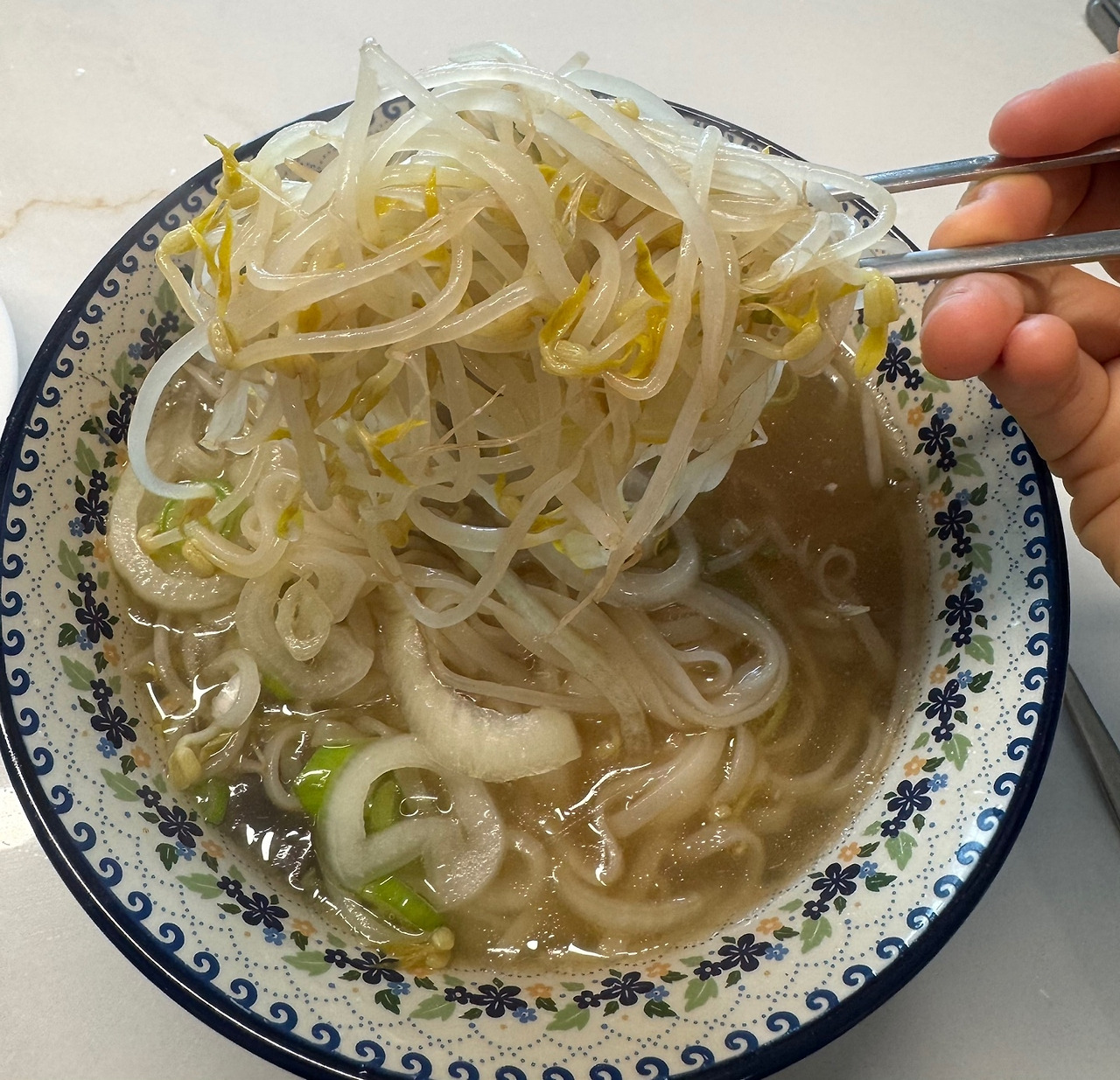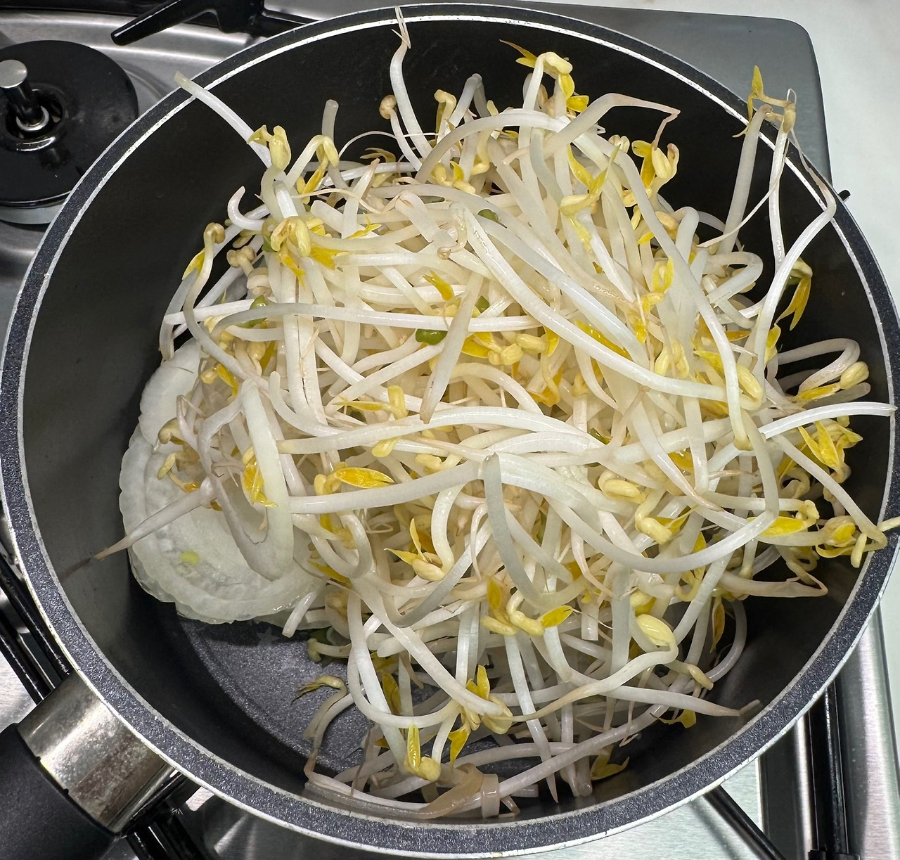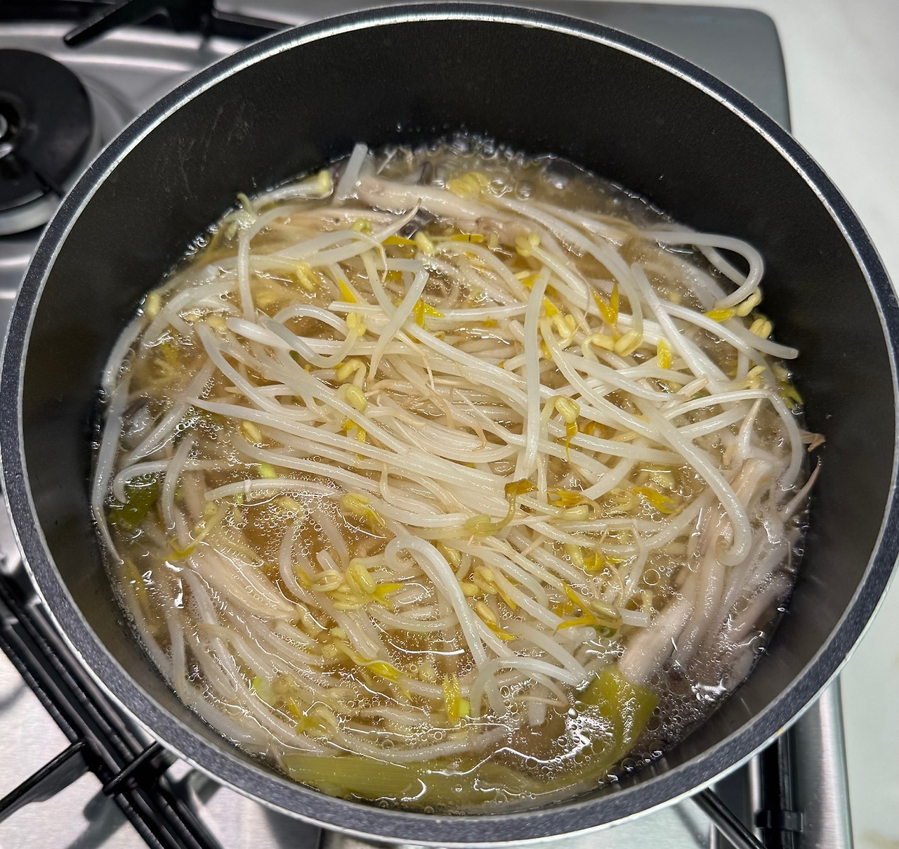 냄비에 닭육수, 쌀국수, 양파, 숙주나물, 진간장 1, 참치액젓 1 넣고 3분 끓여준다.