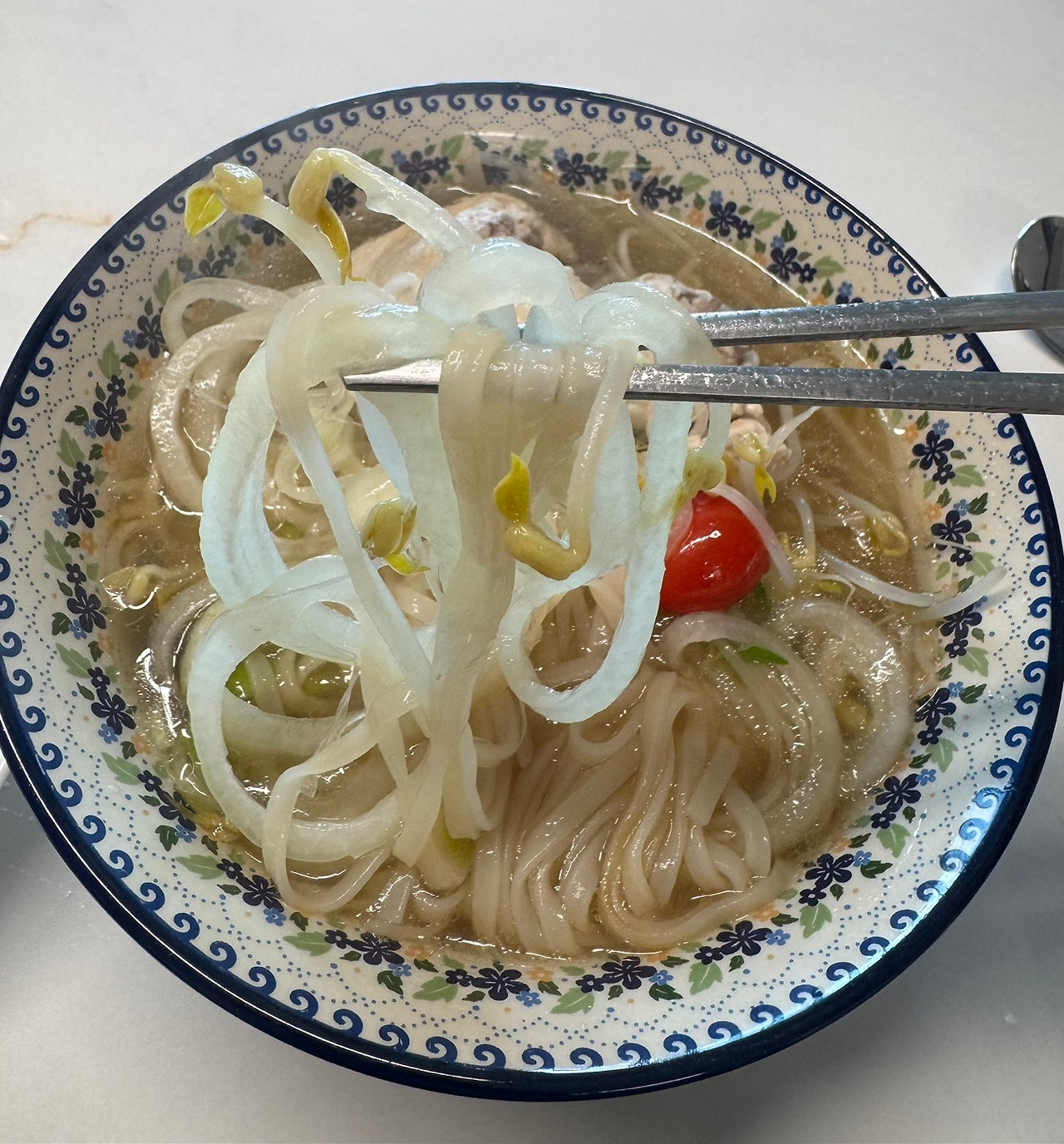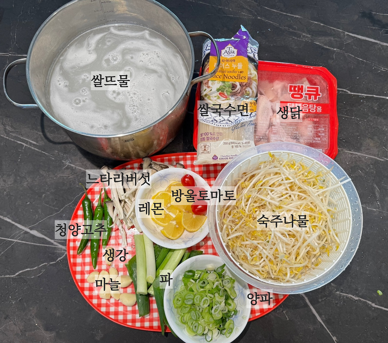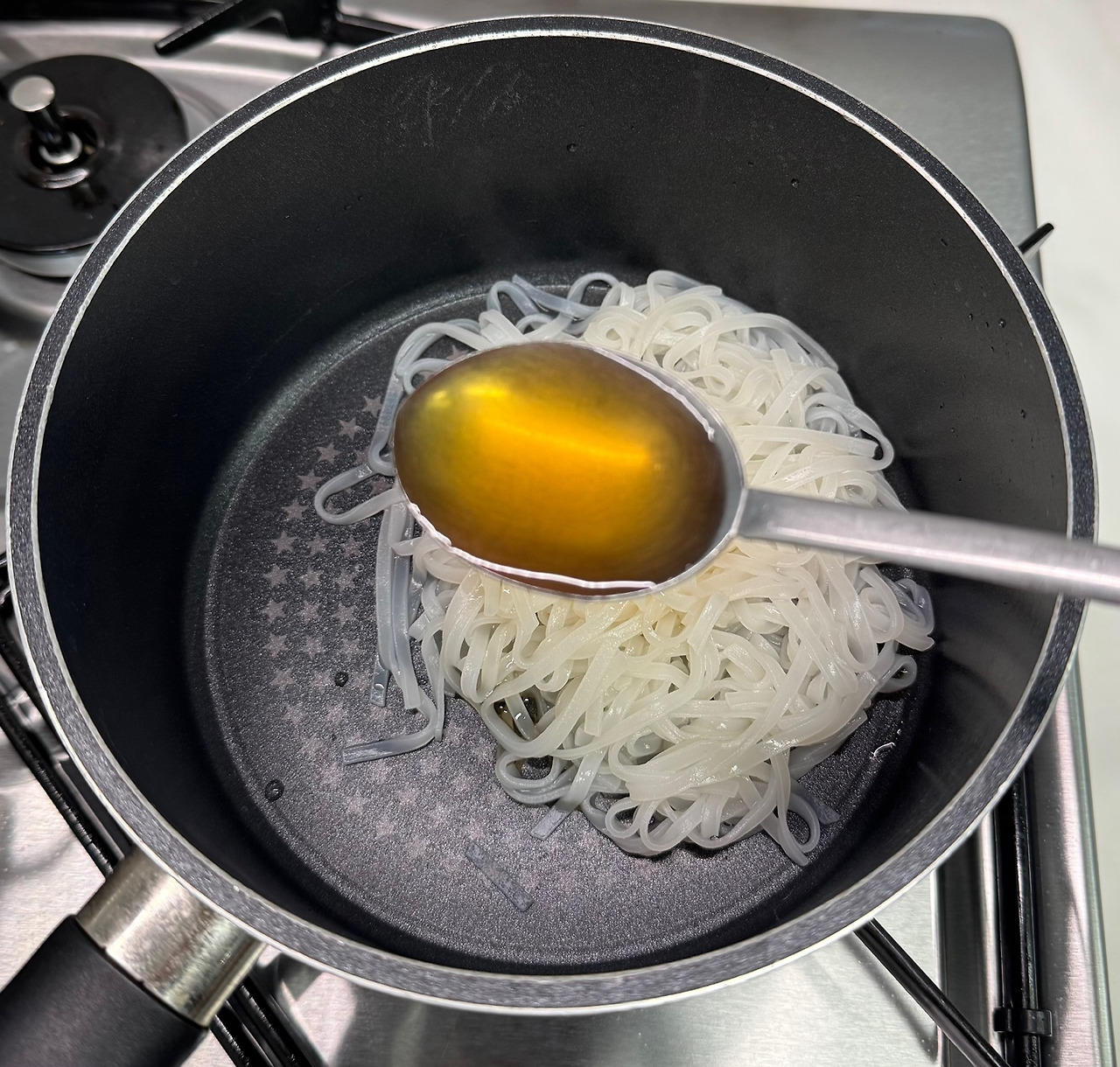 쌀국수면을 닭육수 국물에 직접 삶아도 괜찮지만 한번 따로 끓여봤다. 닭육수에 바로 끓이게 되면 육수에 쌀국수면의 맛이 우러나와 다른 맛을 느낄 수 있다. 따로 삶아 넣는다면 육수가 더 맑은 맛이 난다.