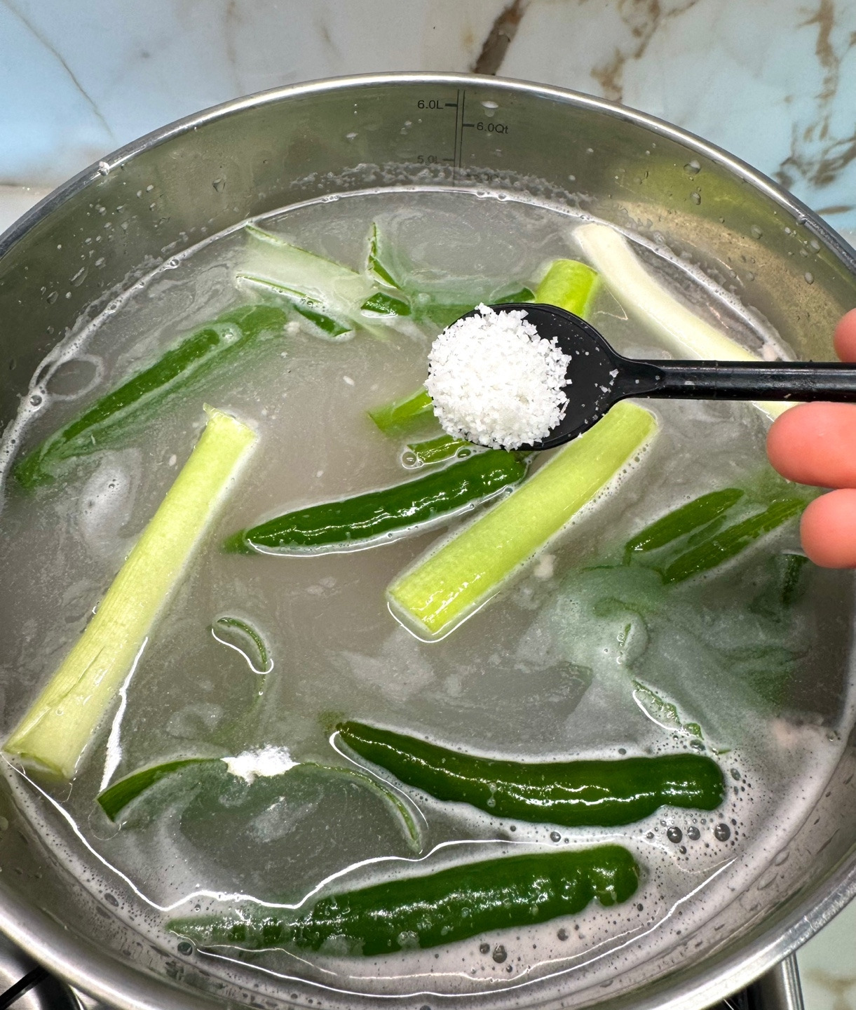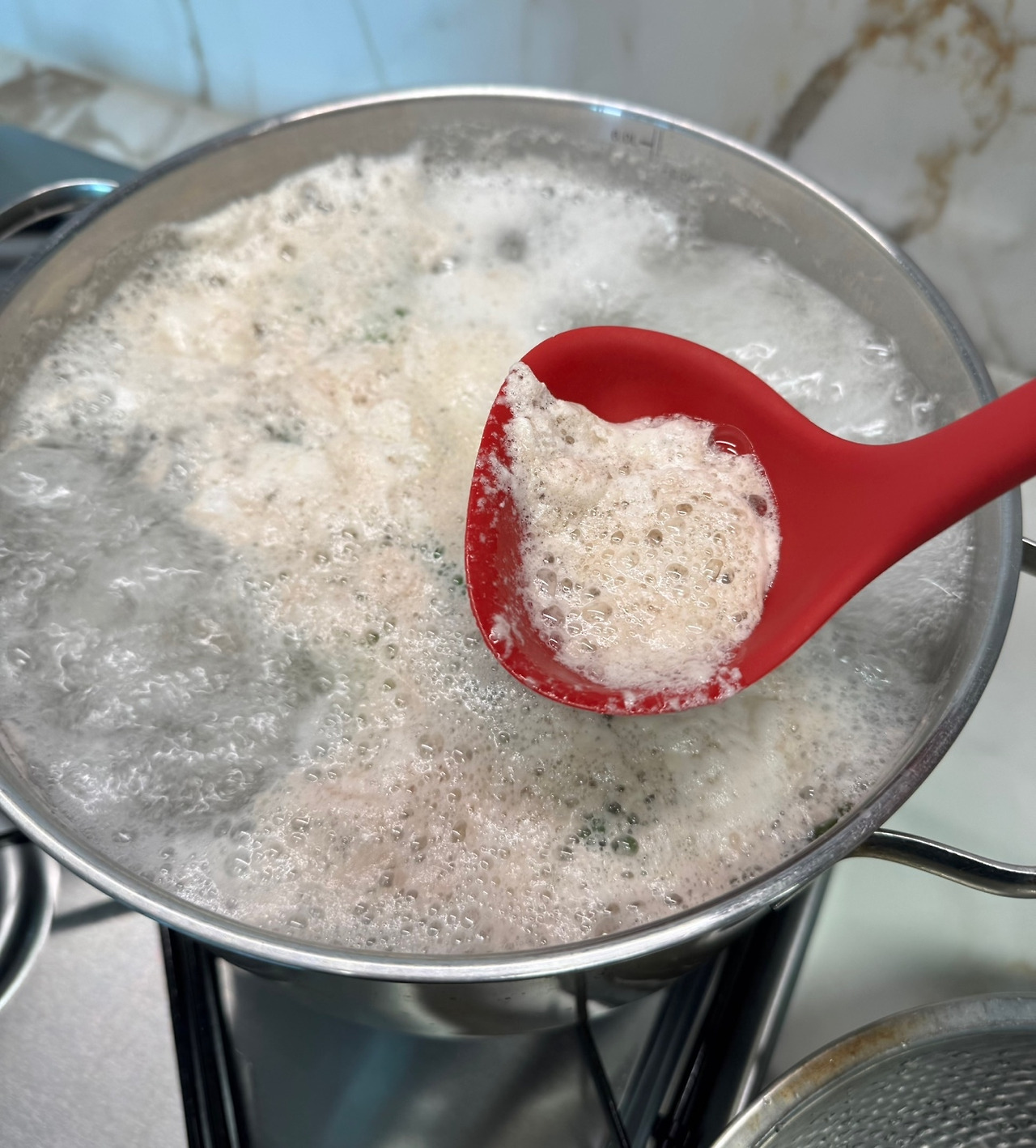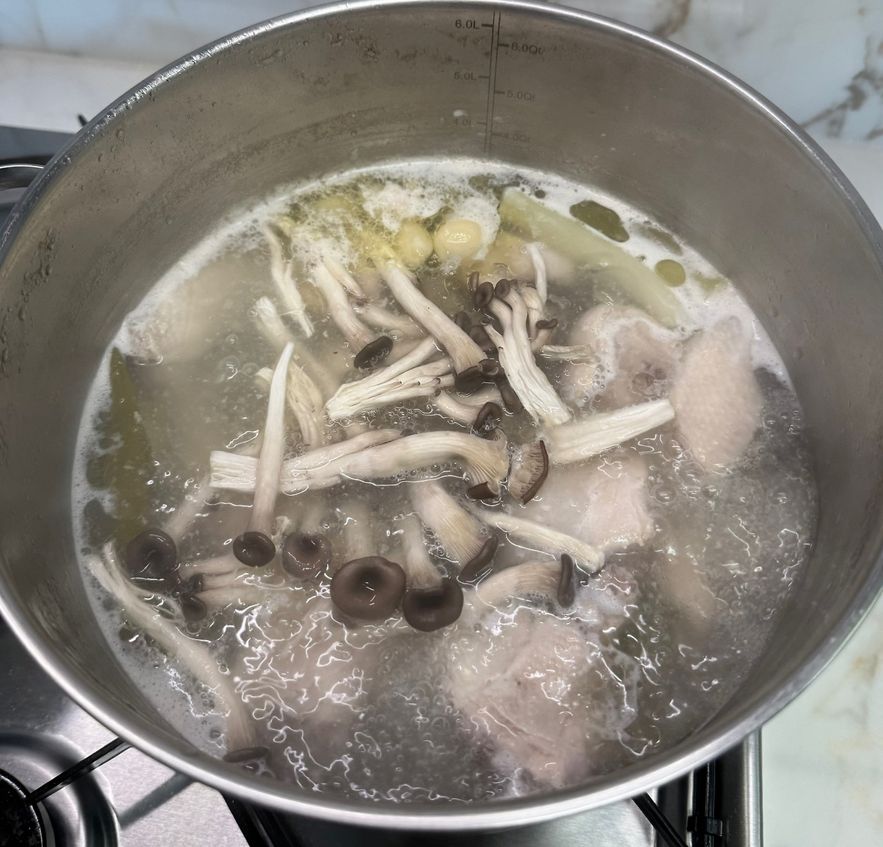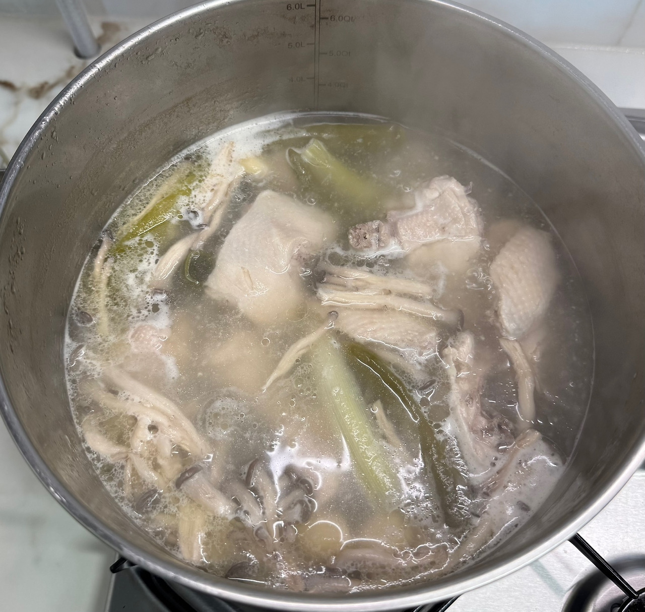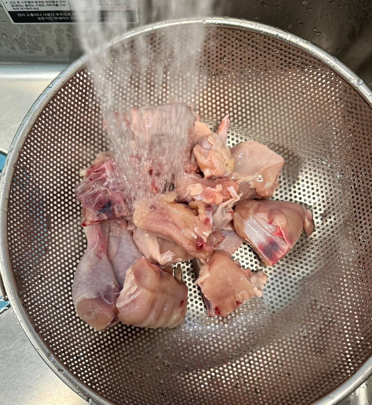 쌀뜨물에 씻은 닭, 파, 마늘, 생강, 청양고추, 소금 1T 넣고 끓여준다.