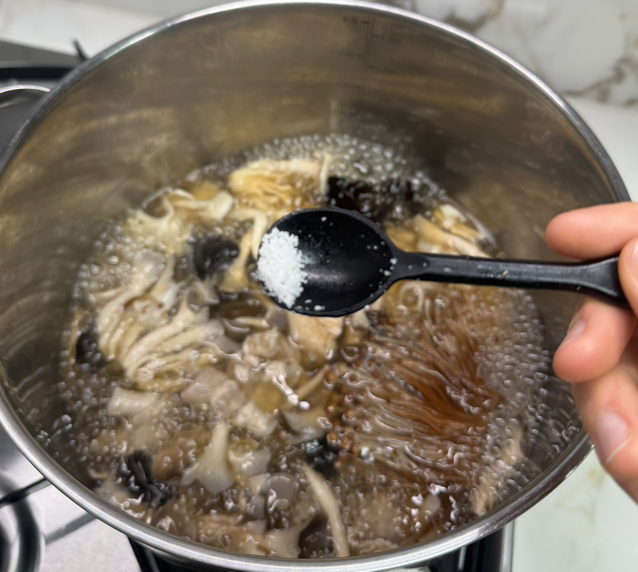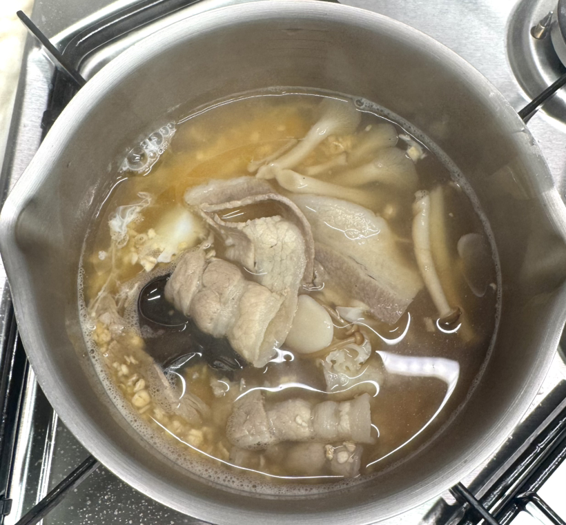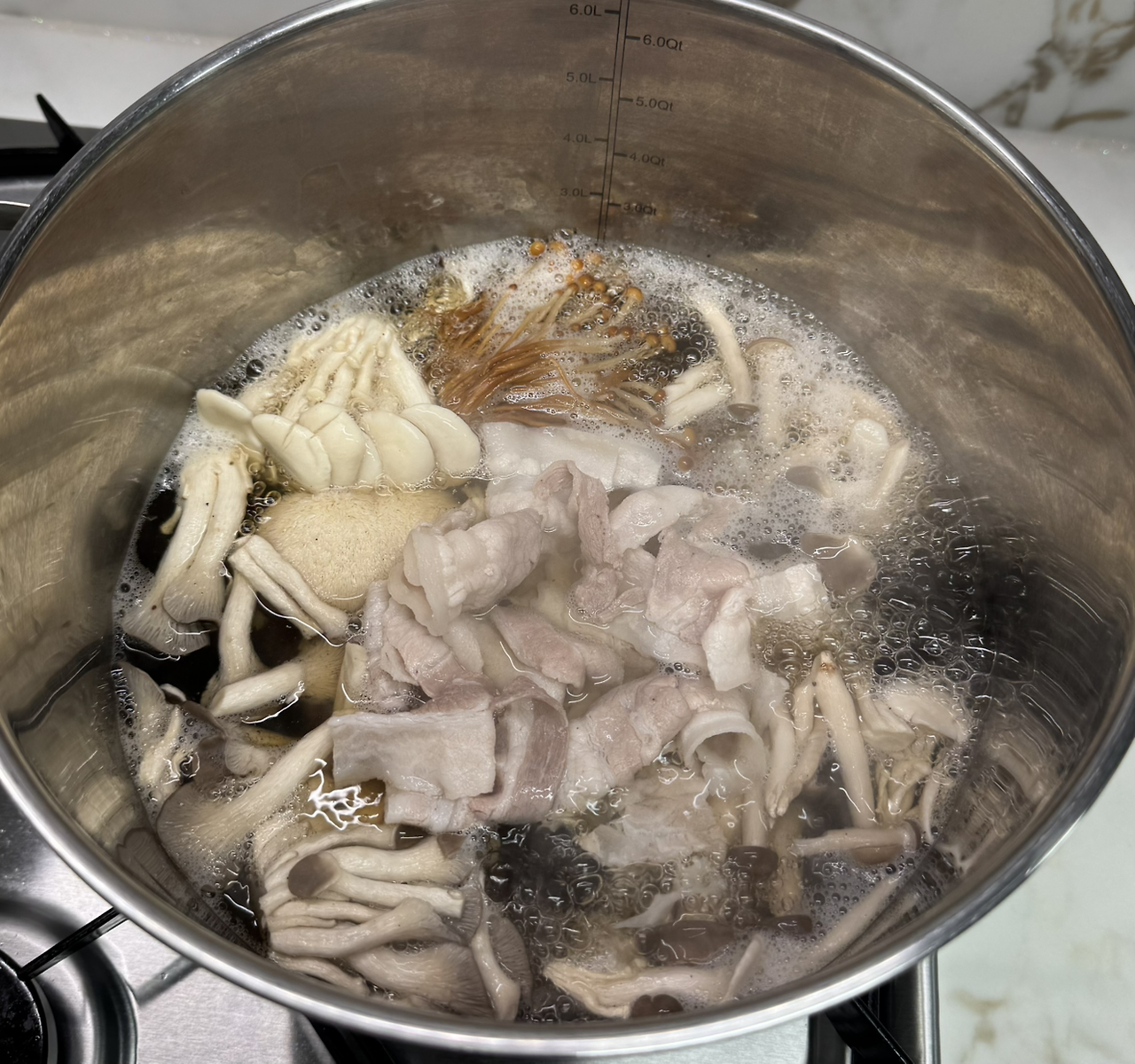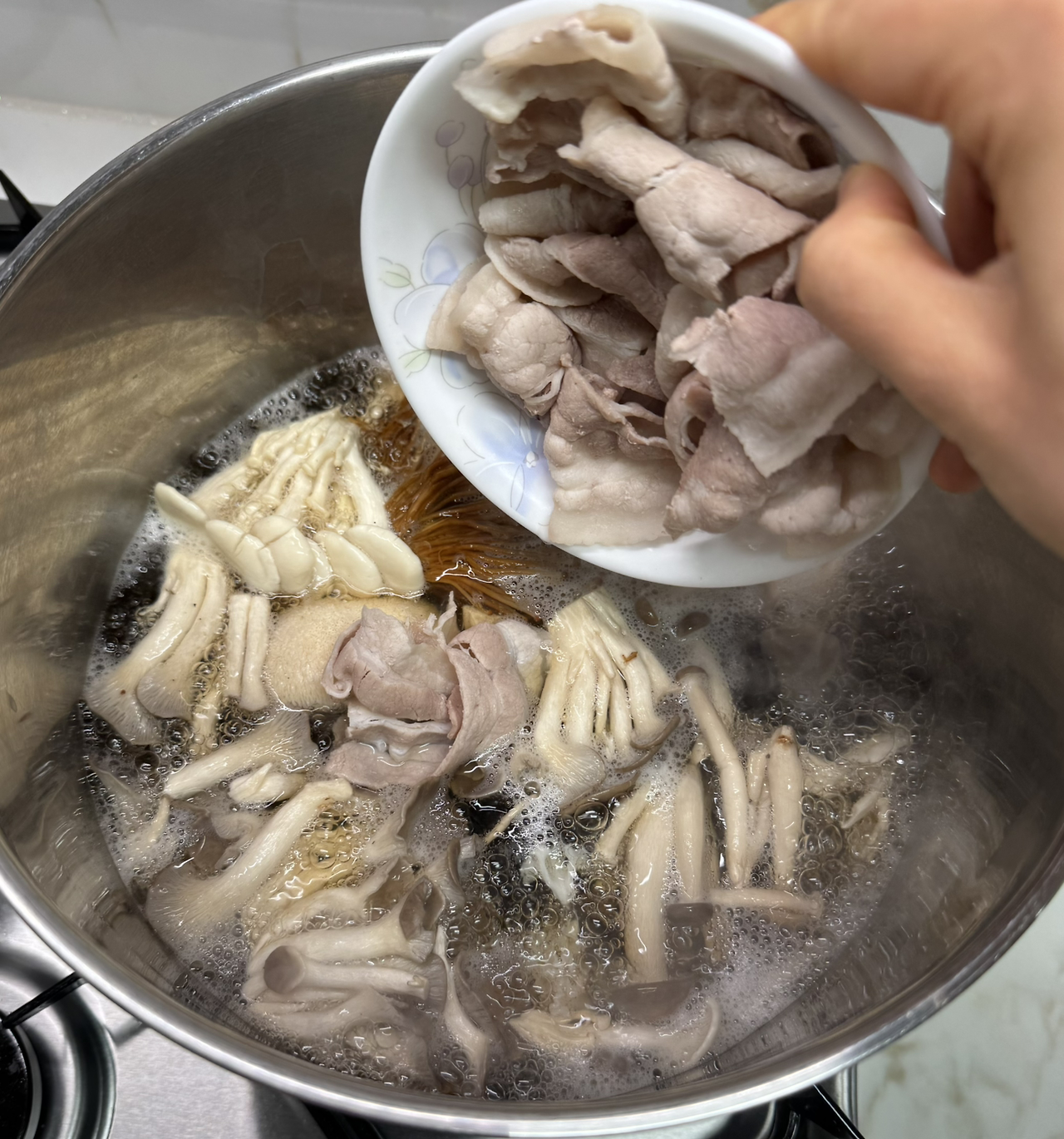 2. 다시팩으로 우린 물에 진간장과 후추를 넣고, 버섯과 익은 대패삼겹살을 넣어 끓인다.
