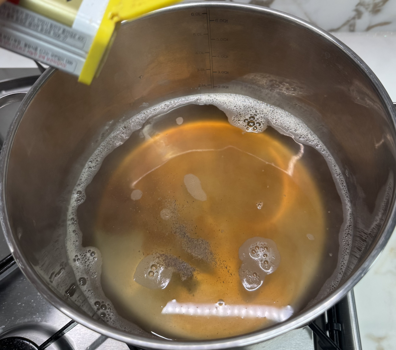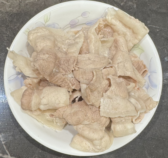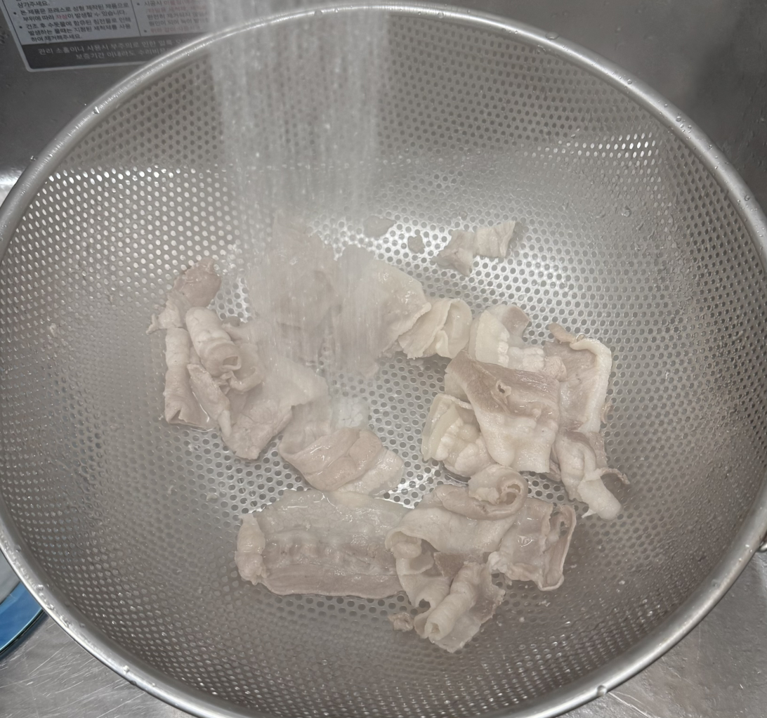 대패삼겹살을 따로 익히는 이유는 냉동상태인 고기를 끓였을 때의 불순물과 잡내를 없애기 위함과, 기름기를 한번 잡아주기 위해 그리했다.