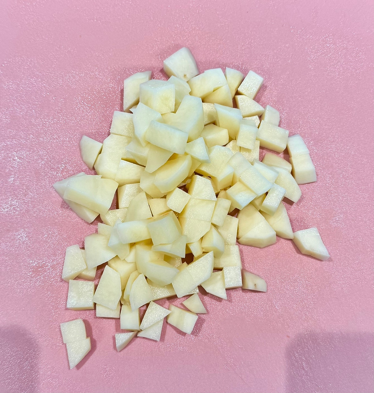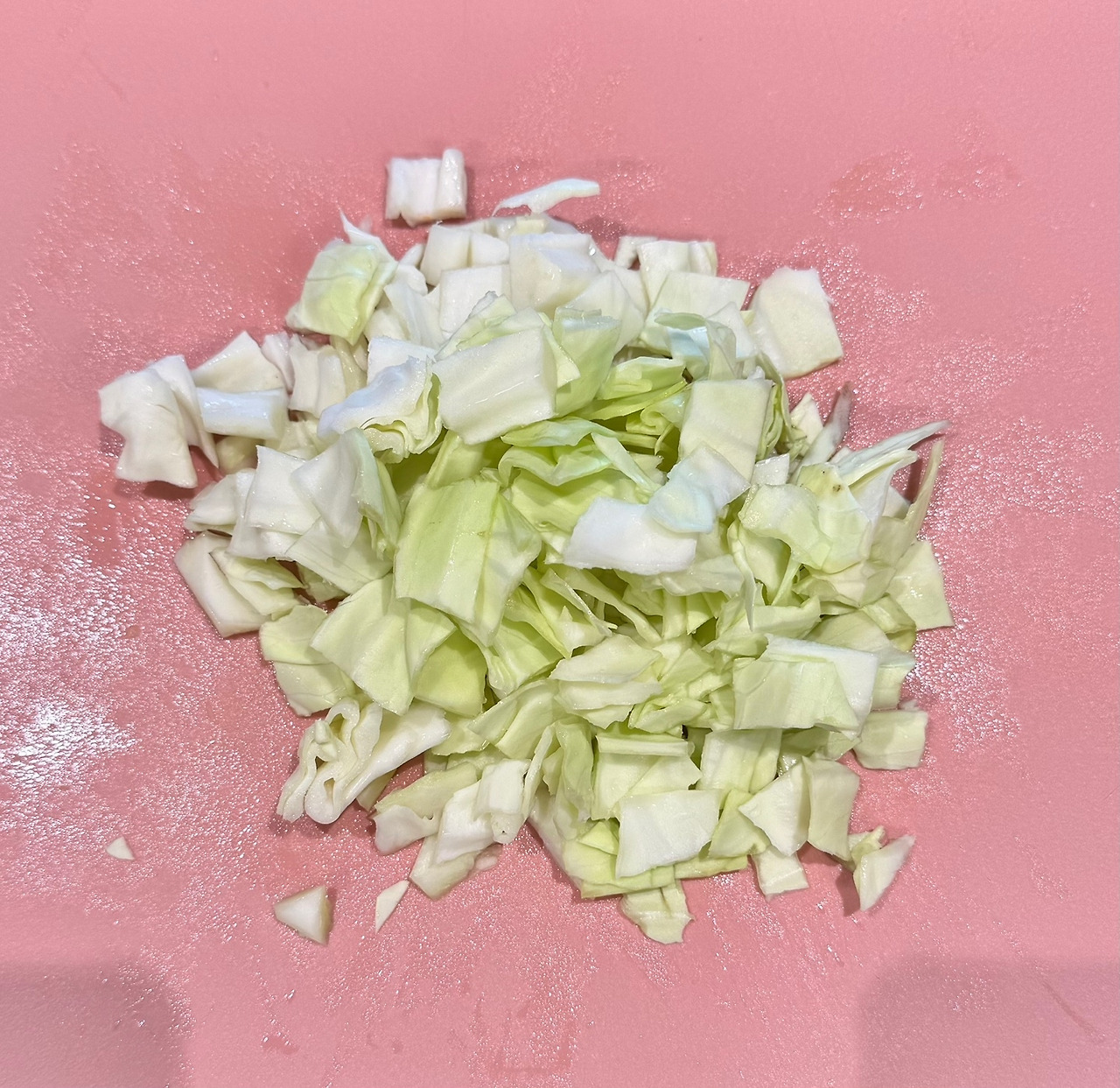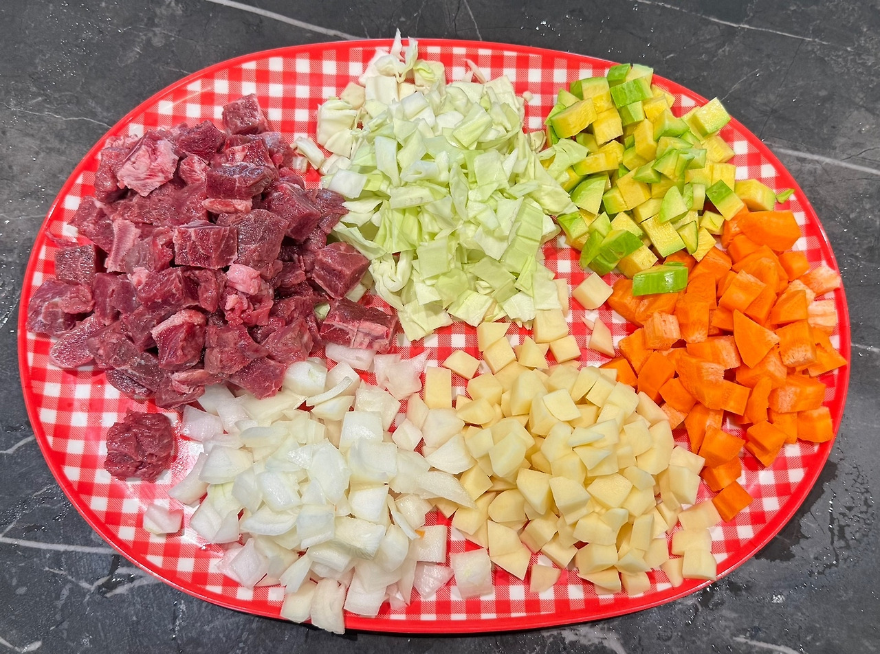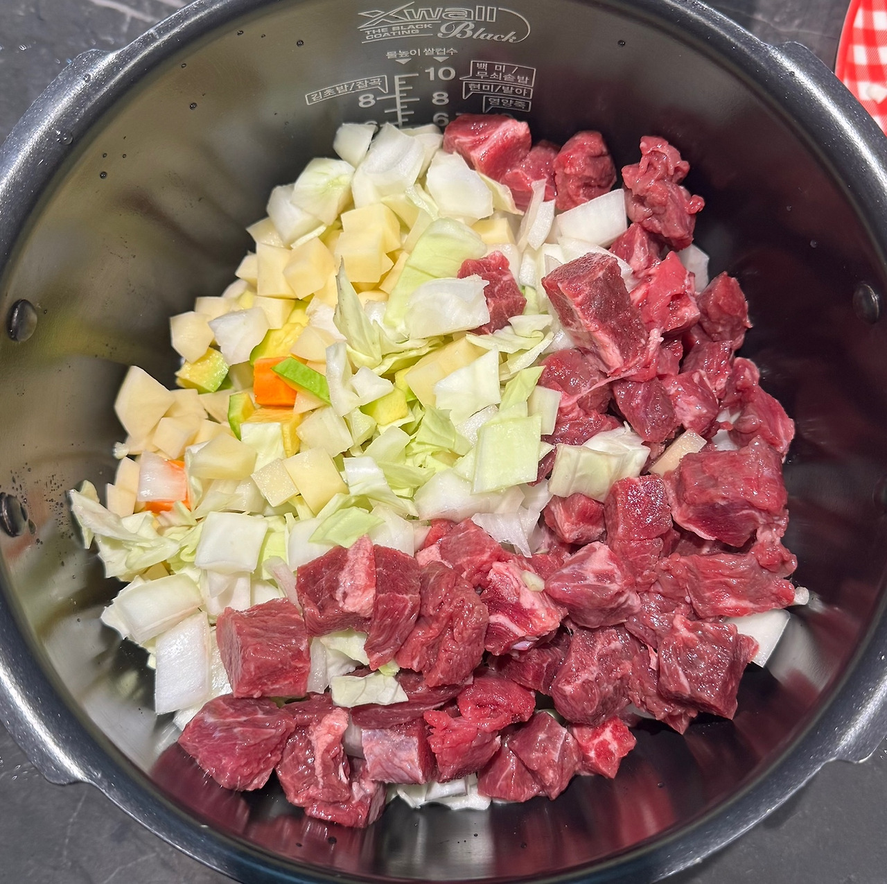 - 건더기 재료(양파, 양배추, 당근, 감자, 소고기, 애호박)를 깍둑 썰어 준비한다.