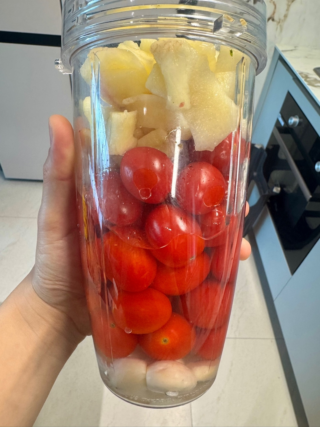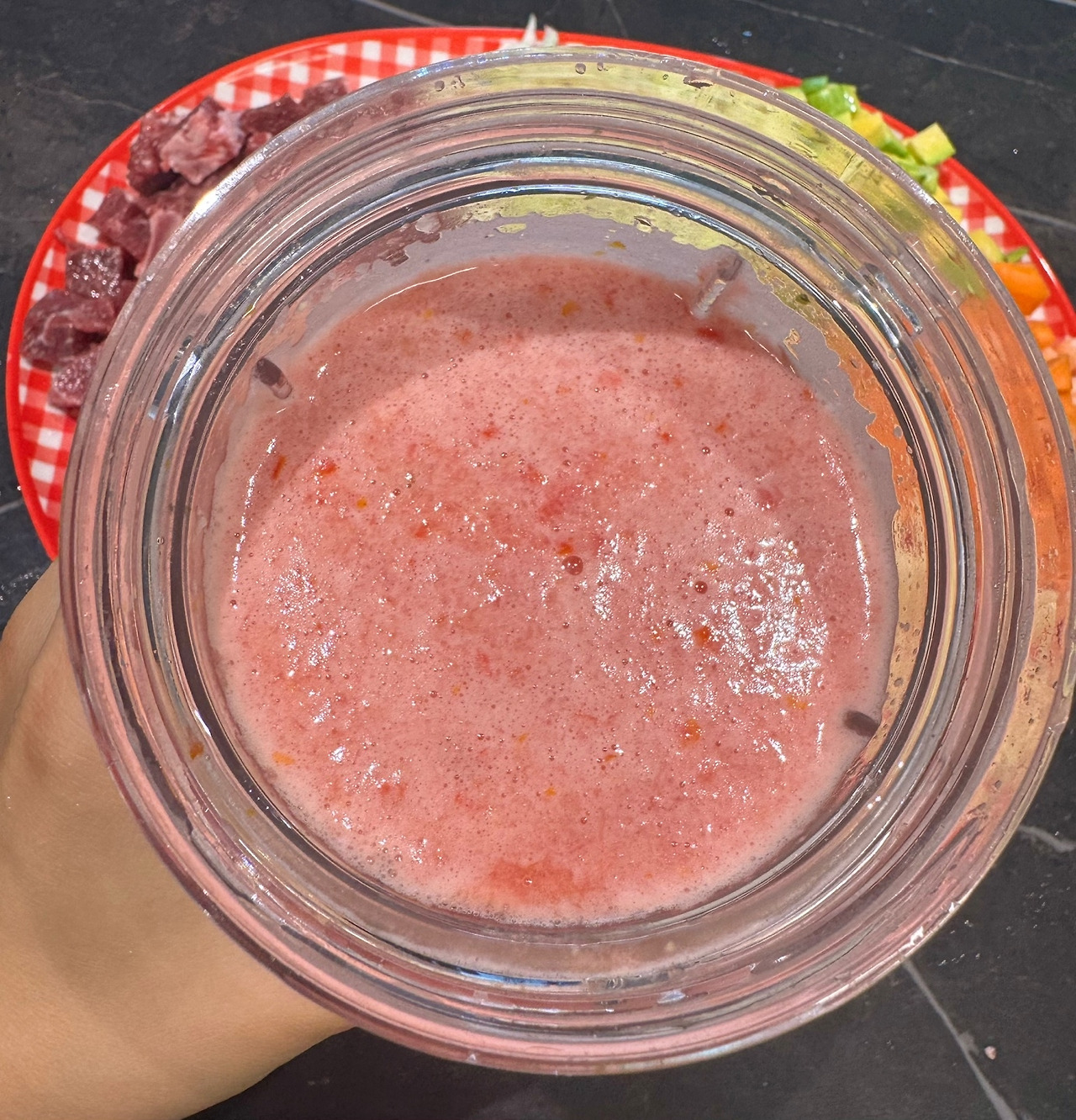 - 소스재료(방울토마토, 마늘, 과일, 물)를 갈아준다.