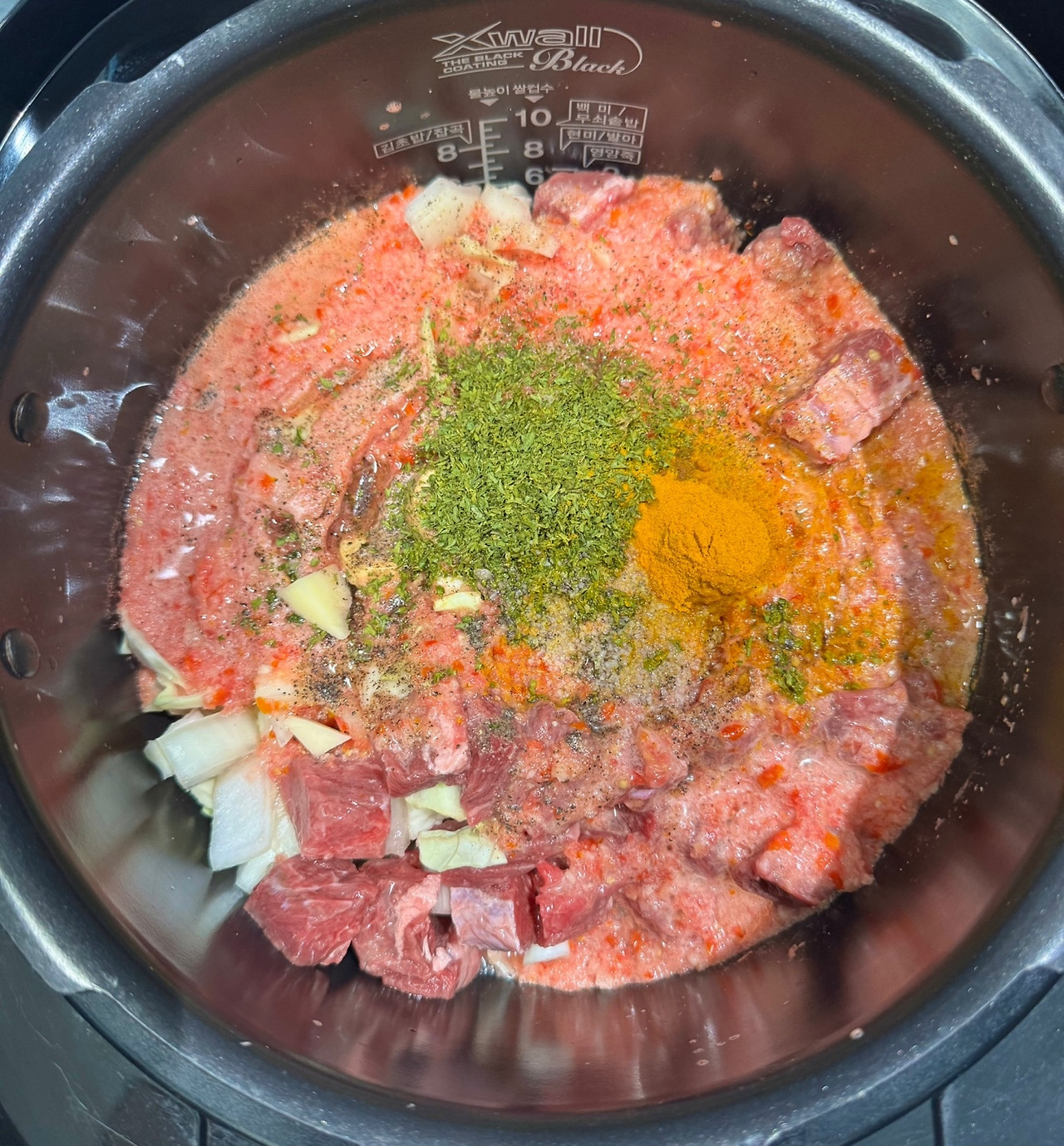 - 양념재료(후추, 코인육수, 파슬리가루, 소금, 강황가루, 레드와인 3스푼, 오일)를 넣는다.