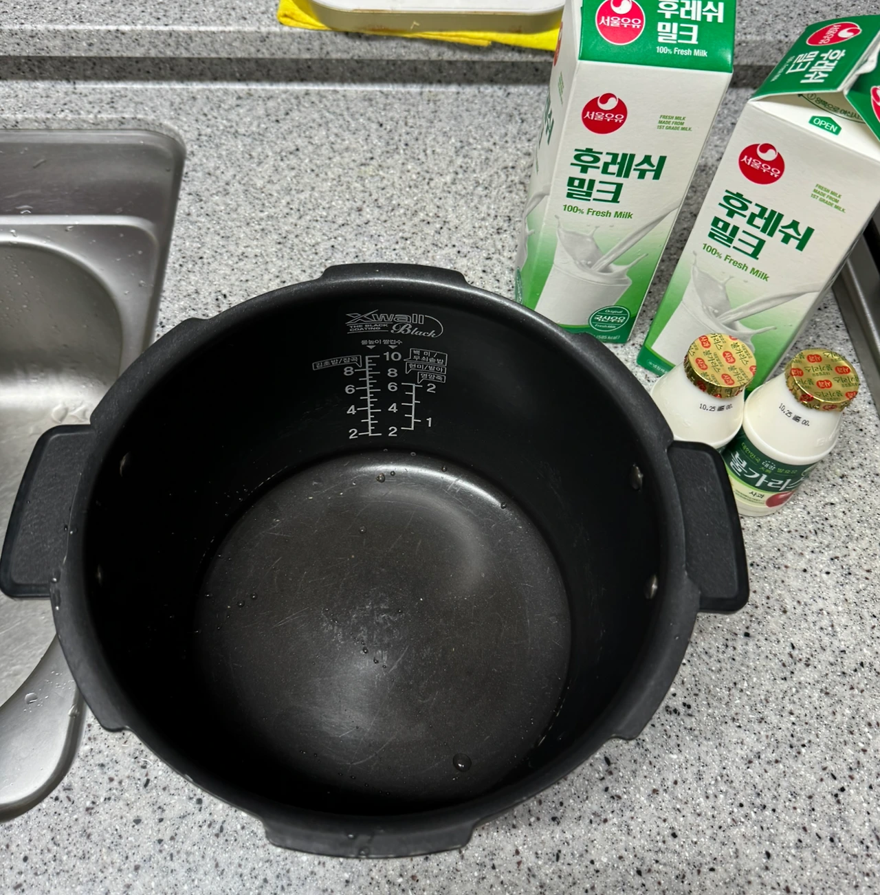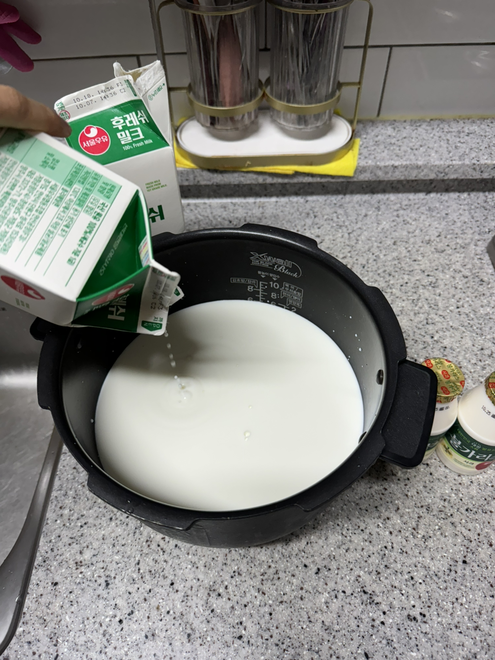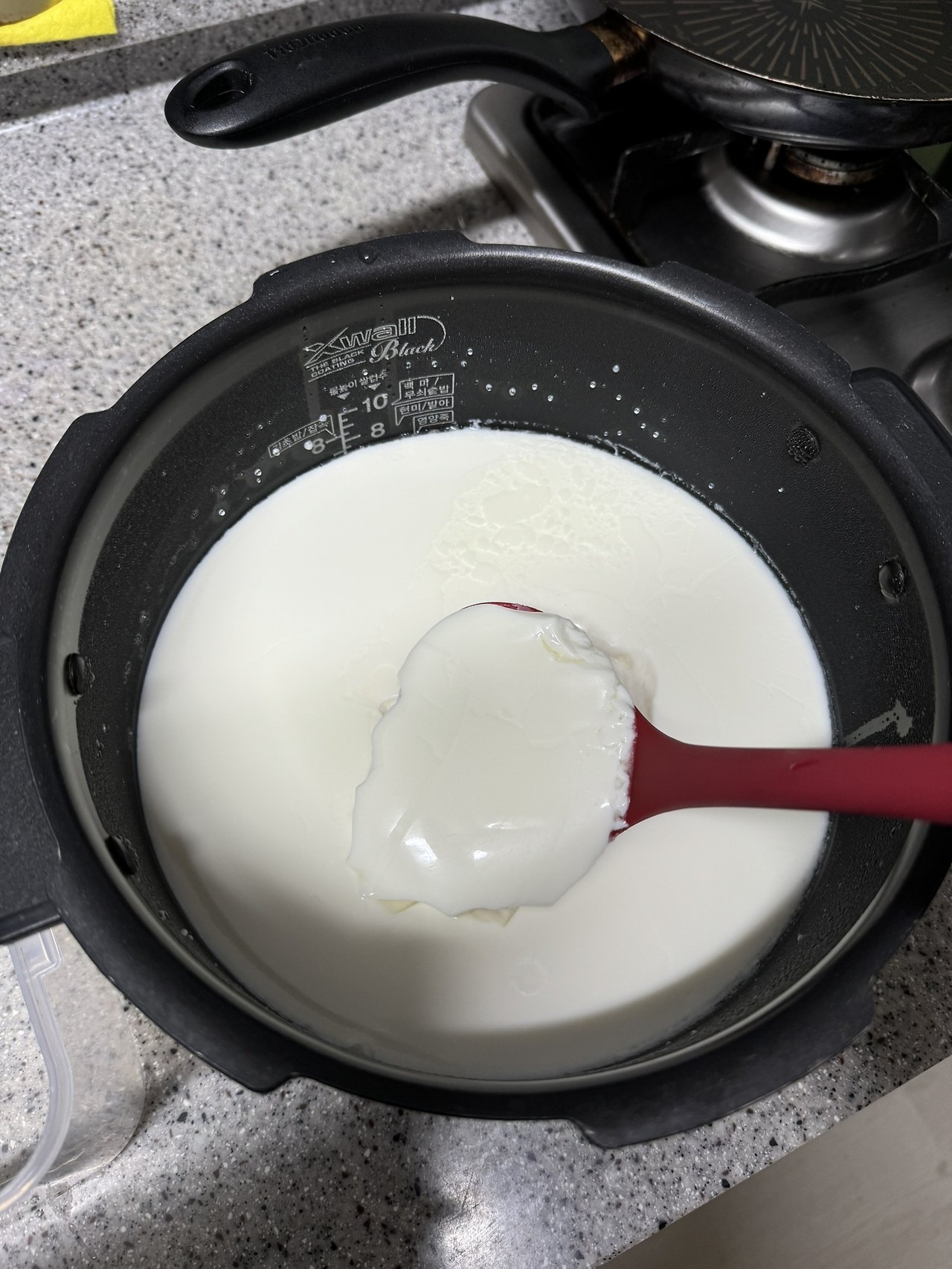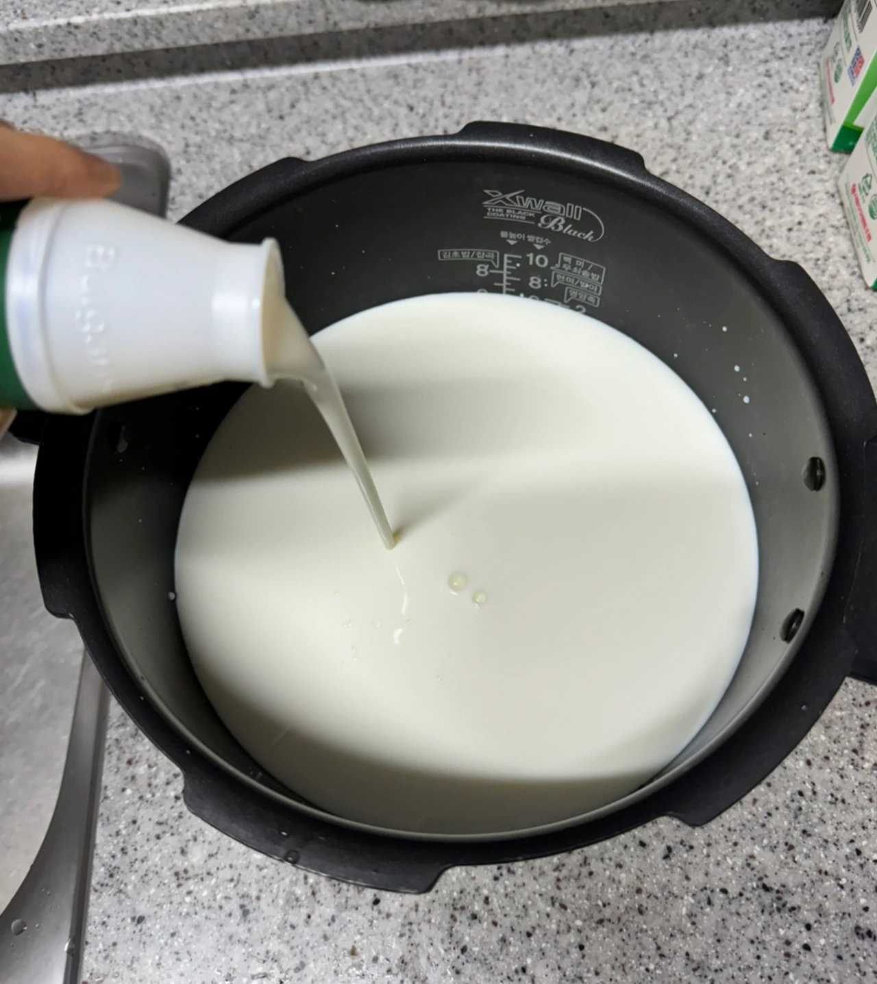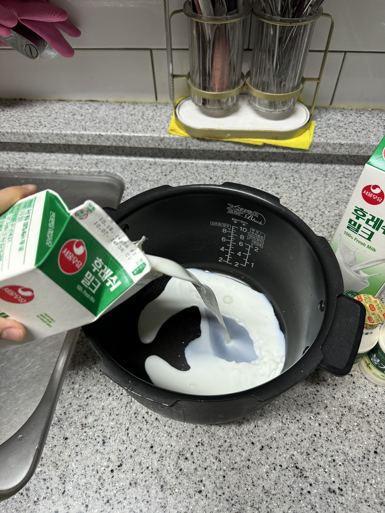 밥솥에 우유 2, 농후발효유 2를 넣고