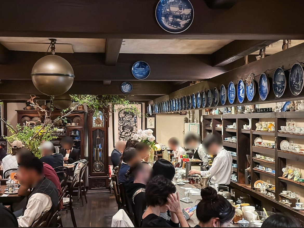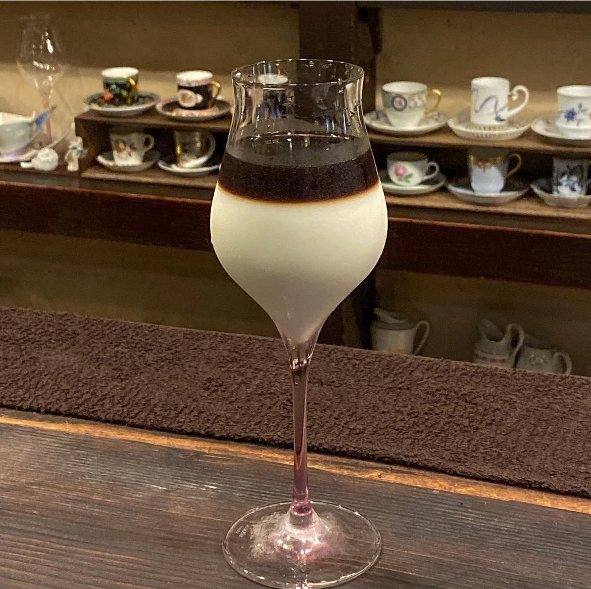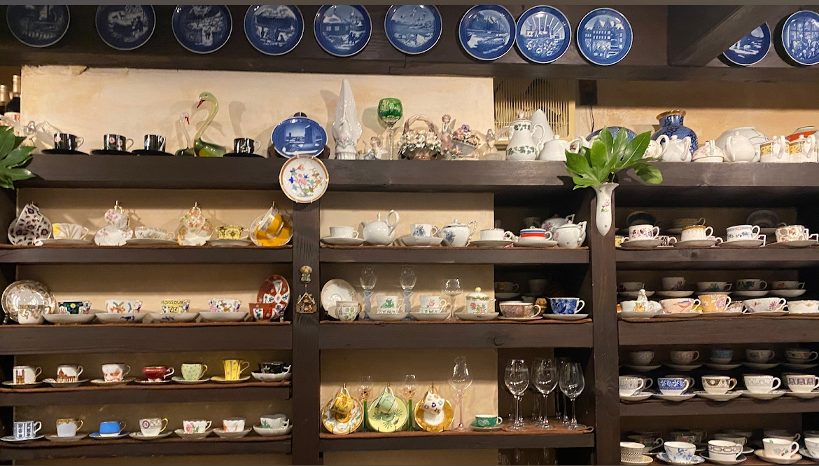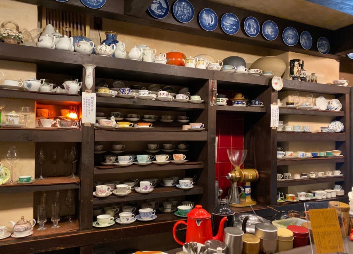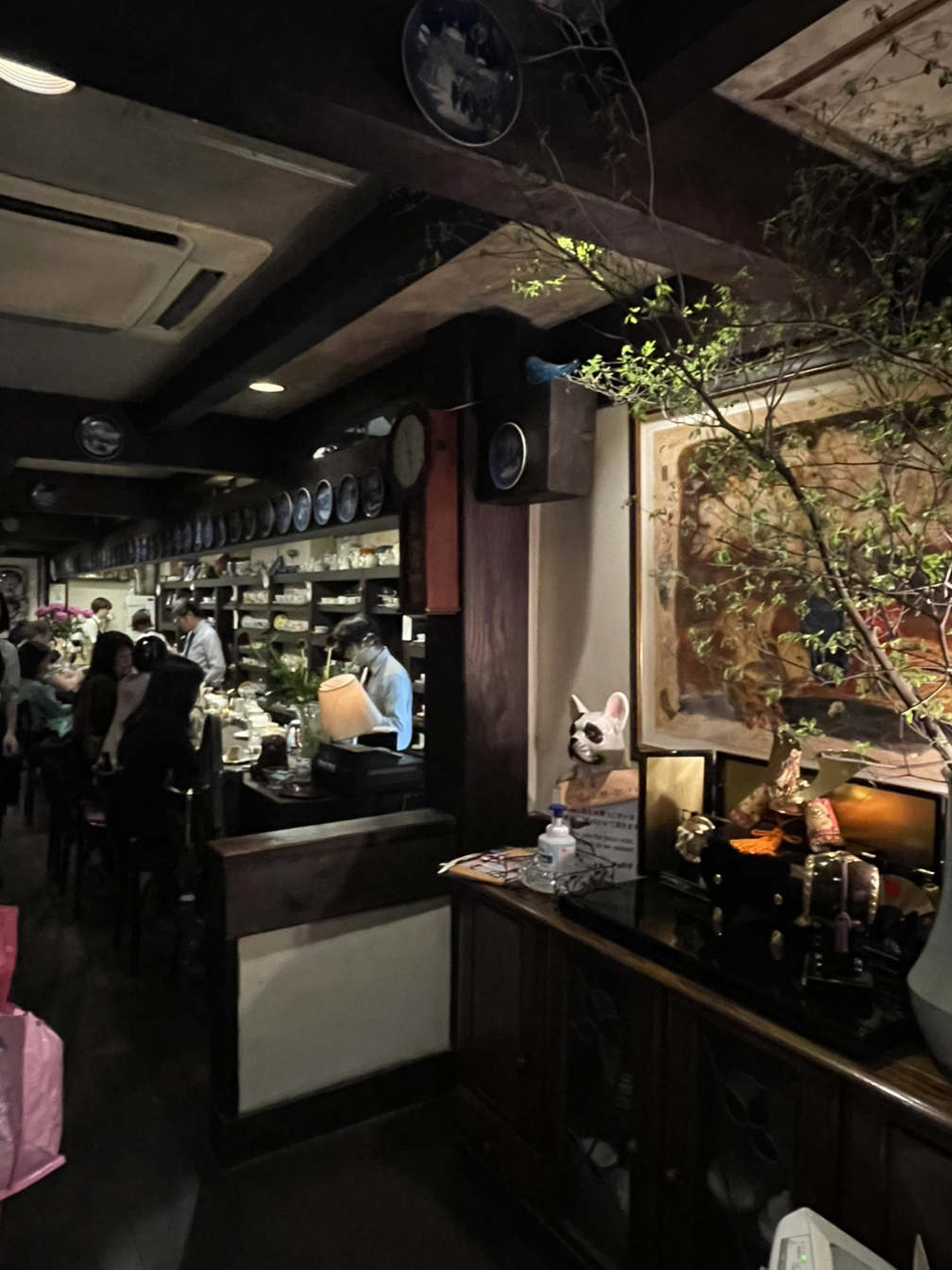 바리스타들이 커피를 만드는 것을 볼 수 있고, 고급 돈카츠집, 스시 오마카세에 키친이 오픈되어 있는 것처럼 바가 오픈되어있다. 바리스타 두 분과 직원 한분, ( 여느 킷사텐이 그렇듯) 주인으로 보이는 할머니 한 분, 이 공간을 대표한다고 볼 수 있는 대장 바리스타 아저씨가 바 너머에서 분주히 메뉴를 준비하고 계신다. 대장 바리스타 아저씨는 정장을 갖춰 입고 계시기에 더 전문적인 느낌을 준다. 그분이 커피 내리는 것을 보고 있자니 손님으로서 대접받고 있는 기분이 난다. 또 접시, 찻잔, 도구들이 바 너머로 쭉 늘어져있어 보는 재미가 있다.