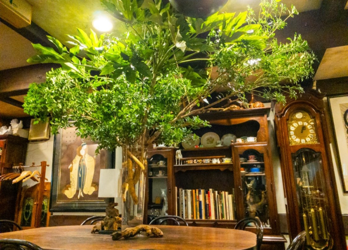 가뜩이나 빈티지 머그잔과 차구, 그림, 대형 시계 (할아버지 시계 같은)로 북적북적하고 여유가 없는 공간인데 저 큰 나무와 꽃까지 있으니 이 공간에는 산소마저 모자랄 거 같은 느낌을 준다. 거기다가 사람이 많고 소리마저 울리니 인테리어를 한답시고 이것저것 때려만 넣은 오늘의 집 자취방처럼 산만한 느낌이 있다.