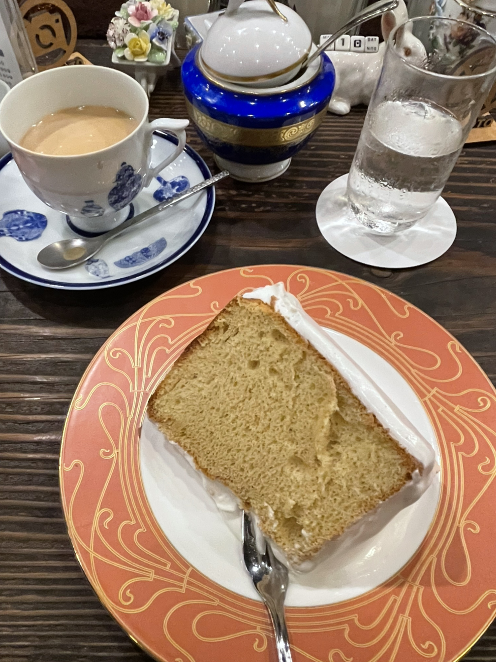 또 주시할 점은 킷사텐이기에 내부가 교토의 오래된 전통 집처럼 낡았다. 내부 인테리어가 오래된 가옥 같은 느낌으로 진한 갈색의 원목 디자인이 베이스다. 또, 전형적인 킷사텐답게 내부가 아주 어둡기 때문에 이러한 형형색색의 빈티지 잔들과 화려한 식기구들이 튀지 않고 어우러진다. 그래서 눈이 피로하지 않고 색깔이 튄다고 느껴지지 않는다. 그렇게 커피와 케익을 시키면, 비로소 화려한 디자인과 형형색색의 색깔들이 눈에 들어온다. 케익과 커피가 화려한 잔과 접시에 담긴 채로 나에게 오게 되고, 그제서야 내 앞에 놓인 것들을 관찰하면서 " 아, 이곳의 잔과 식기구가 이렇게 귀여웠구나!" 하고 깨닫게 된다.