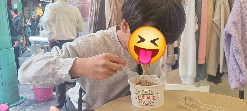 근처 상점 직원에게 자문 받은 곳은 '아종면선'이라는 국숫집. 첫 끼니는 밥이어야 했던 나에게 '면' '국수' 같은 키워드는 환영받지 못하는 존재였으나 가보기로 했다. 그리고 식당 앞에 당도하고 나서야 그곳이 책자에서 본 유명 맛집이란 걸 알았는데, 다들 서서 먹는다더니 정말 한 손에 국수를 들고 있는 자들이 진을 치고 있는 게 아닌가. 그늘진 곳, 앉을 수 있는 곳은 어디든. 하지만 내가 누구인가! 아들 한 명을 골라 줄 서기에 동참시키고는 앉을 수 있는 곳을 재빨리 물색했다. 그렇게 근처 호두과자 가게 테이블에서 버젓이 곱창 국수를 먹던 자의 자리를 이어받아 점원과 구매 약정을 맺고는 '대' 사이즈 두 그릇을 올려놓았다.