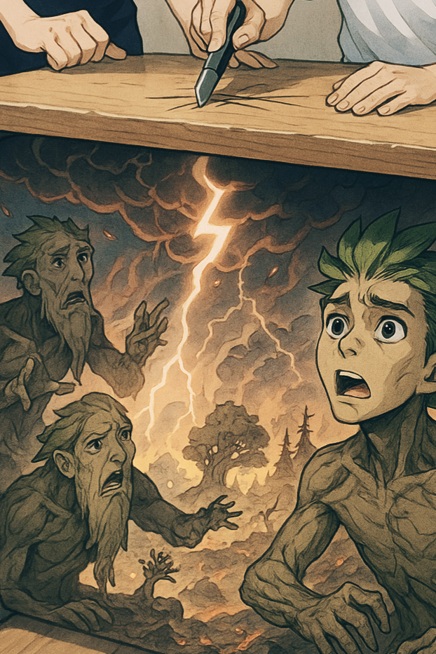 “그 안에는, 지금 이 순간에도 수많은 생명들이 살아 숨 쉴 수 있다. 우리가 보지 못하는 건, 그 세계가 너무 작아서일 뿐이다. 하지만 네가 지금 칼로 이 나무를 베거나, 원자의 결을 무너뜨리는 순간, 그 미시적인 세계에서는 하늘이 무너지고 땅이 갈라지는 종말이 일어날 수 있다. 그건 그들에게 있어 아마겟돈과 다르지 않다.”