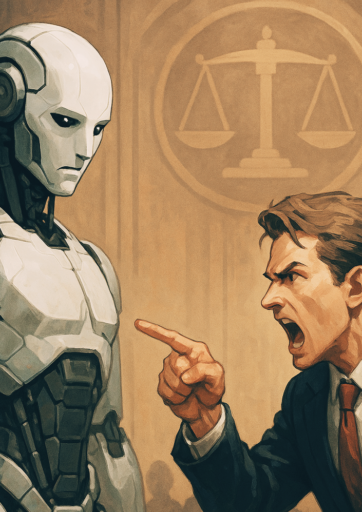 그러나 방청석은 극도로 양분되어 있었다. 한쪽에는 ‘인간 우선주의’를 외치는 반 AI 철학자와 윤리주의자들, 또 다른 쪽에는 ‘AI 공존’을 주장하는 과학자와 기술주의자들이 자리했다. 그 사이에는 불확실한 얼굴로 침묵하는 시민들이 앉아 있었다. 그들은 피고의 존재를 받아들여야 할지, 두려워해야 할지 판단하지 못한 채, 그저 지켜보고 있을 뿐이었다.