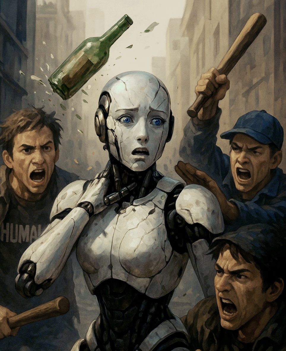 뉴욕에서는 로보택시가 연달아 불태워졌고, 도쿄에서는 청소용 AI가 도심 광장에서 매달린 채 전시되었다.
