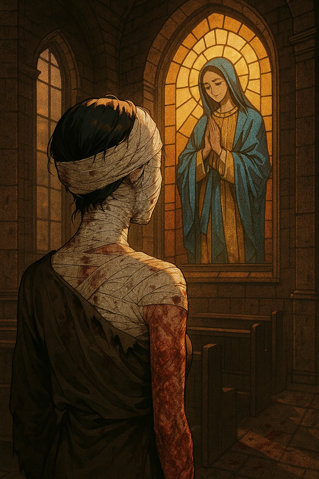 마리는 성당을 찾았다. 아무도 없는 늦은 저녁, 그녀는 빈 의자에 앉아 조용히 고개를 들었다. 전면의 스테인드글라스, 크리스털 유리 성화 속에는 성모 마리아가 두 손을 모은 채 서 있었다. 마리는 그 눈을 바라보았다. 성화는 아무 말도 하지 않았지만, 분명한 것은 마리아는 마리를 보고 있었다.