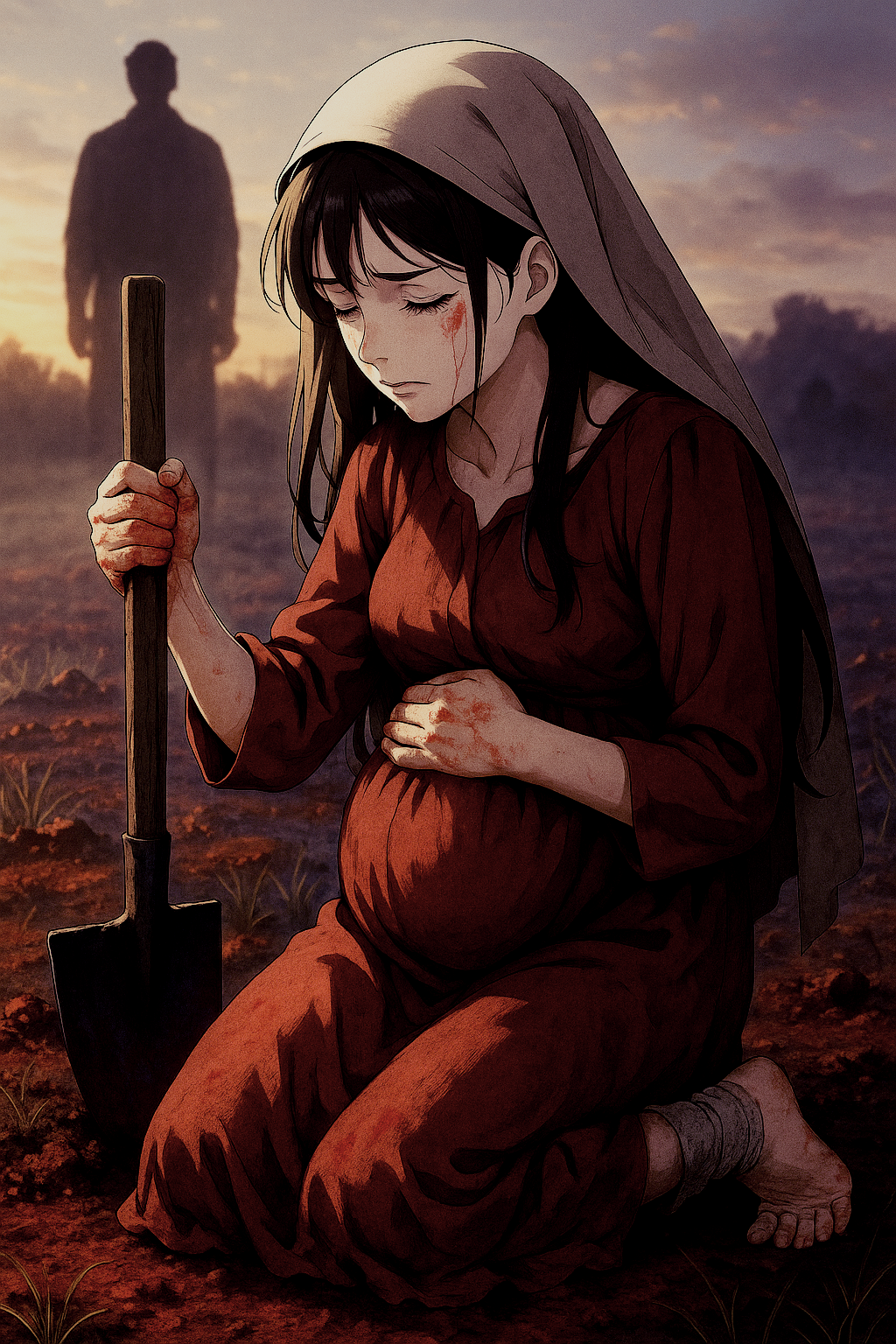 그의 검은 그림자는 마리아가 쏟아낸 붉은 얼룩 위로 길게 드리워졌다. 눈동자가 흔들렸으나, 그는 다시 각오를 다지듯 삽을 들었다.