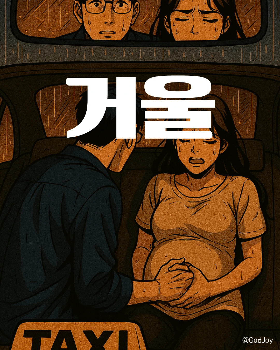 룸미러 속에 비친 두 사람은 말없이 강렬했다. 윤서는 배를 감싸 안고 고통에 떨고 있었고, 지훈은 젖은 머리끝에서 떨어지는 빗물로 그녀의 배를 적시고 있었다. 그리고 그 빗물의 진동은 마치 새로운 생의 신호처럼, 조용히 그러나 단단하게 울려 퍼졌다.
