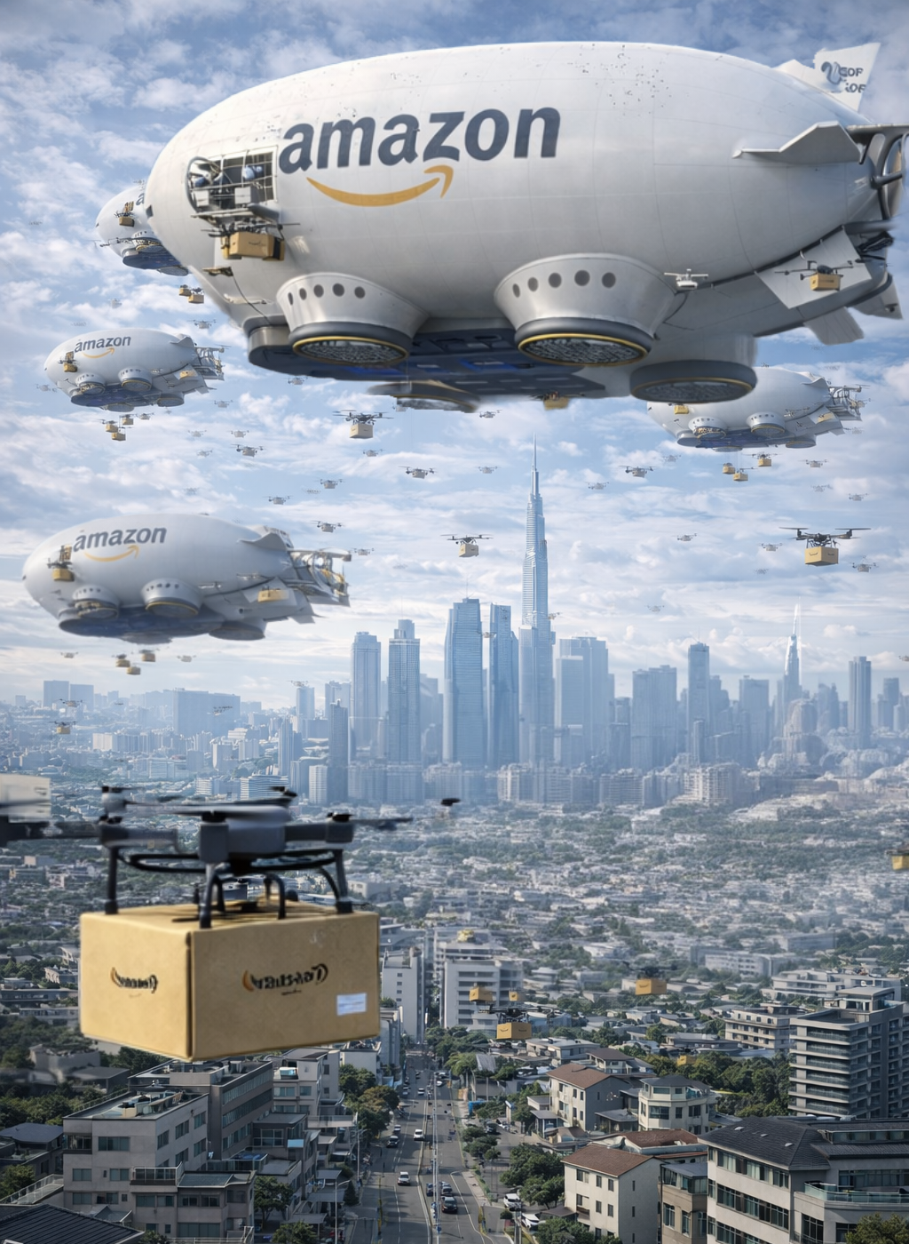 하늘을 단순한 이동 통로가 아니라 “떠 있는 물류 허브”로 사용하는 구조도 이미 상상으로만 남아 있지 않습니다. Amazon은 Prime Air로 드론 배송을 실험해 왔지만, 더 확장된 그림은 이렇습니다. 도심 외곽의 대형 물류센터에서 픽업트럭이 도로를 지나 아파트 단지까지 들어오는 구조가 아니라, 거대한 항공 물류 비행체가 도시 상공 특정 구역 위에 ‘머무는’ 것입니다.