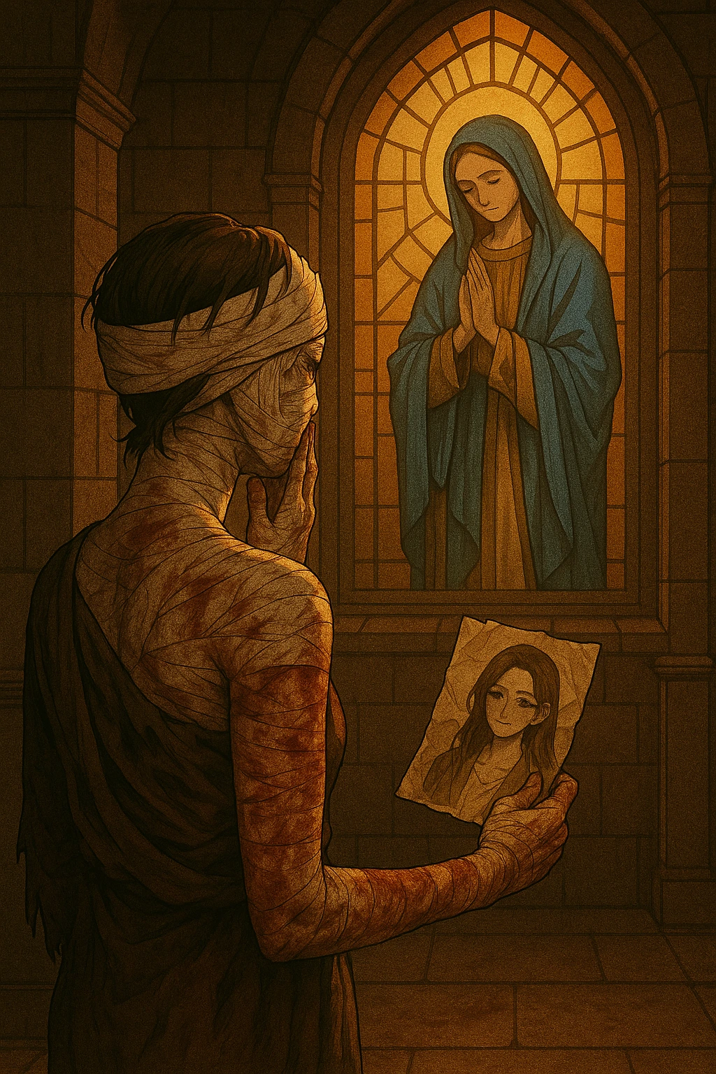 그 빛 한가운데에는 마리아 상이 있었고, 그 위에는 마치 거울처럼 지금의 마리 얼굴이 겹쳤다. 화상으로 일그러진 얼굴, 붕대에 감싸인 몸, 고개 숙인 어깨가 투영되어 있었다. 그녀는 입을 열지 못한 채 속으로 중얼거렸다.