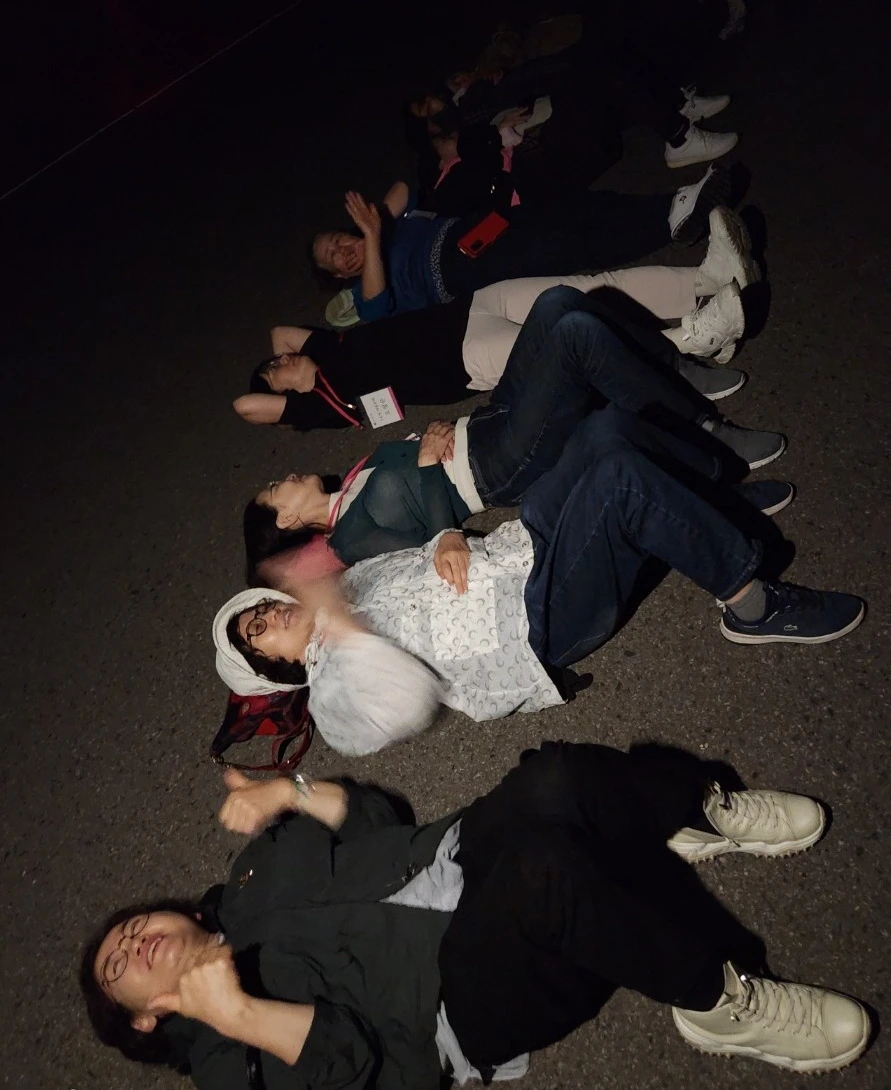 일주문 앞에 일렬로 드러누운 까마귀 떼