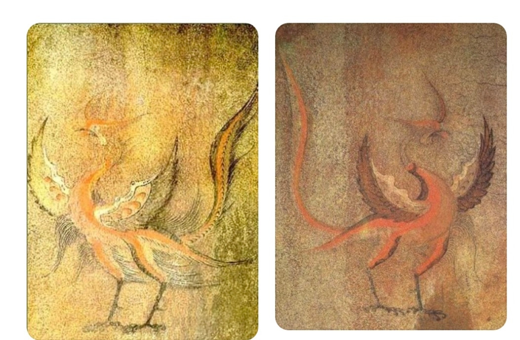 오회고분5호 정남향의 묘실 문을 열고 들어서자 습기를 머금은 싸한 기류와 널방 벽면을 가득채운 사신도의 현묘한 기운이 온몸으로 쓰며든다. 출입구 좌우 안벽 주작朱雀 한 쌍이 활활 타오르는 불꽃 깃털에 화려한 벼슬을 뽐내며 춤을 추는 듯.
