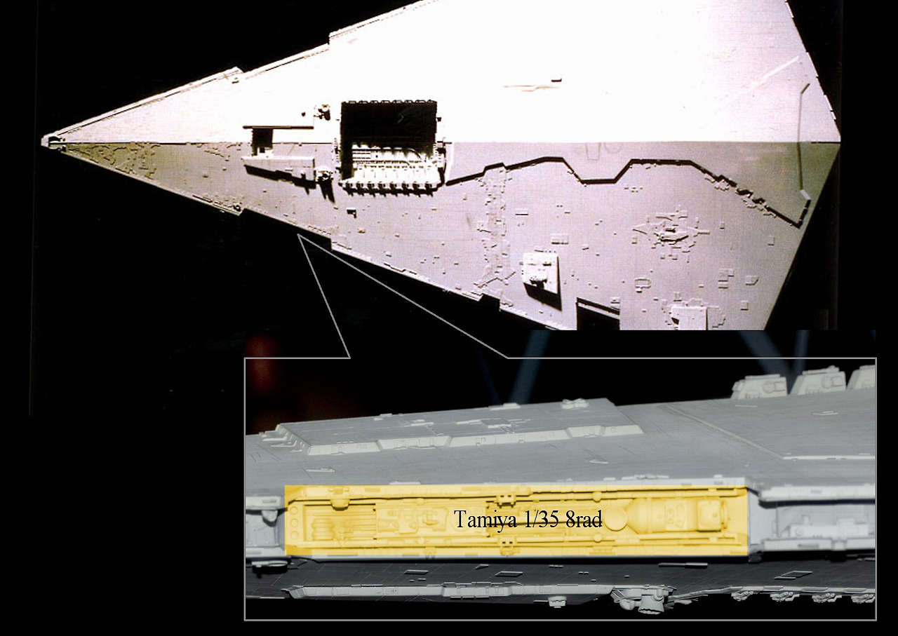 이전 회차에서도 언급한 것처럼 ILM 모델러들은 기존의 프라모델 킷들의 일부를 활용하는 킷배싱(Kitbashing) 방법으로 '스타워즈'에 사용된 우주선들의 디테일링을 완성했다. 물론, 이것은 'Star Destroyer'에서도 동일하게 적용되었다.