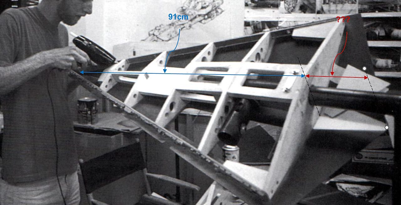 저 사진 속의 빨간색 화살표 부분을 생각하지 못한 것이다. 내부 프레임 구조물의 크기가 91cm인건 맞지만, 실제 'Star Destroyer' 모델은 그 뼈대 구조물 위에 상판과 하판을 덧대어 거기에 디테일링을 했기 때문에