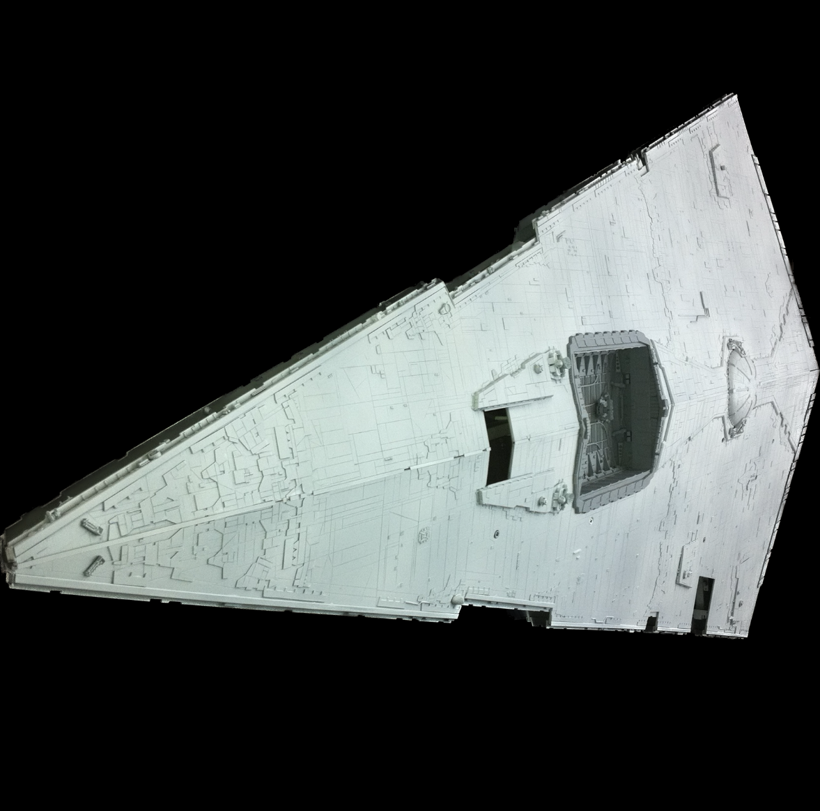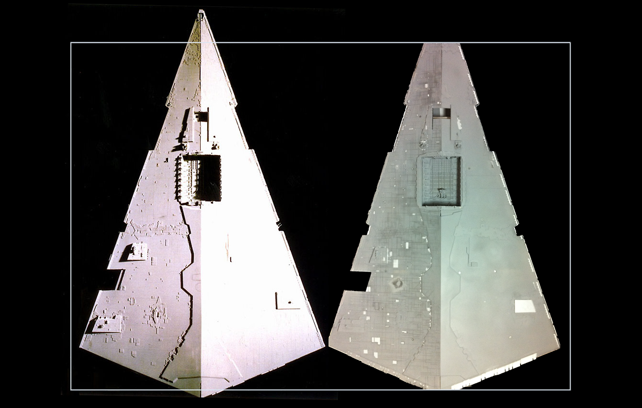 그 이유는 실제로 1977년작 '스타워즈'에 등장하는 'Star Destroyer'는 주로 하부와 후면의 모습이 스크린에 보인다. ILM은 제작과정 당시 주어진 시간과 예산의 제약을 극복하기 위해 실제 스튜디오 모델이 스크린상에 보이는 부분만 디테일을 추가했고 나머지는 빈 공간으로 두었다.