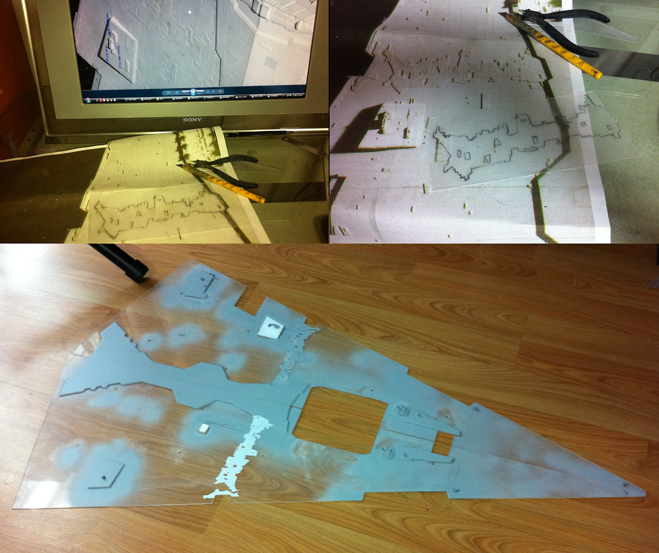 다음으로, 출력물 위에 투명 플라스틱판을 올리고 오리저널의 디테일과 주요 패널라인을 사진의 모습에 따라 그려준다.