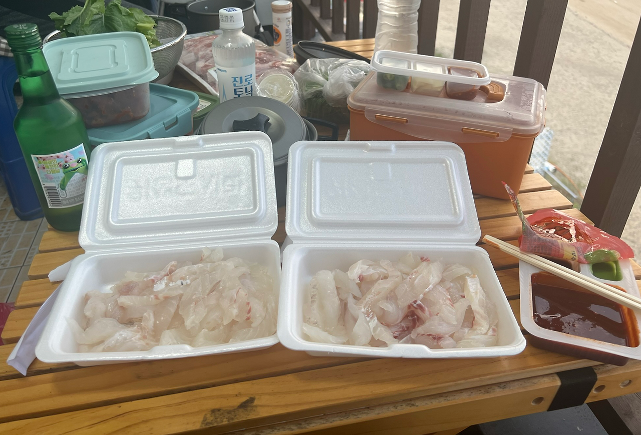 저녁엔 회를 포장해 와서 숙소 테라스에서 먹었다.