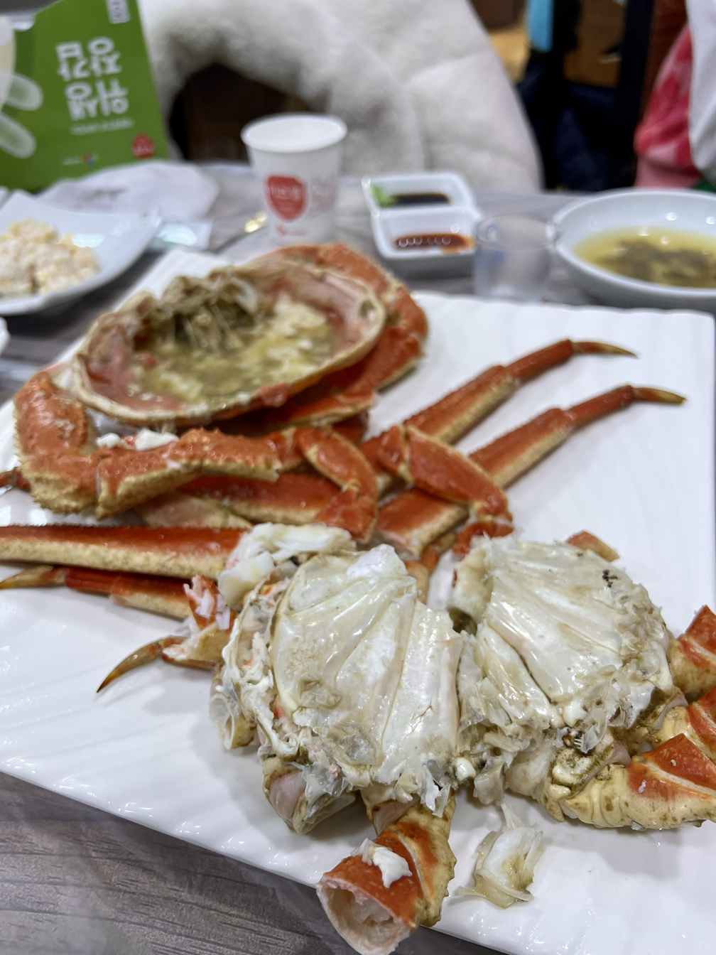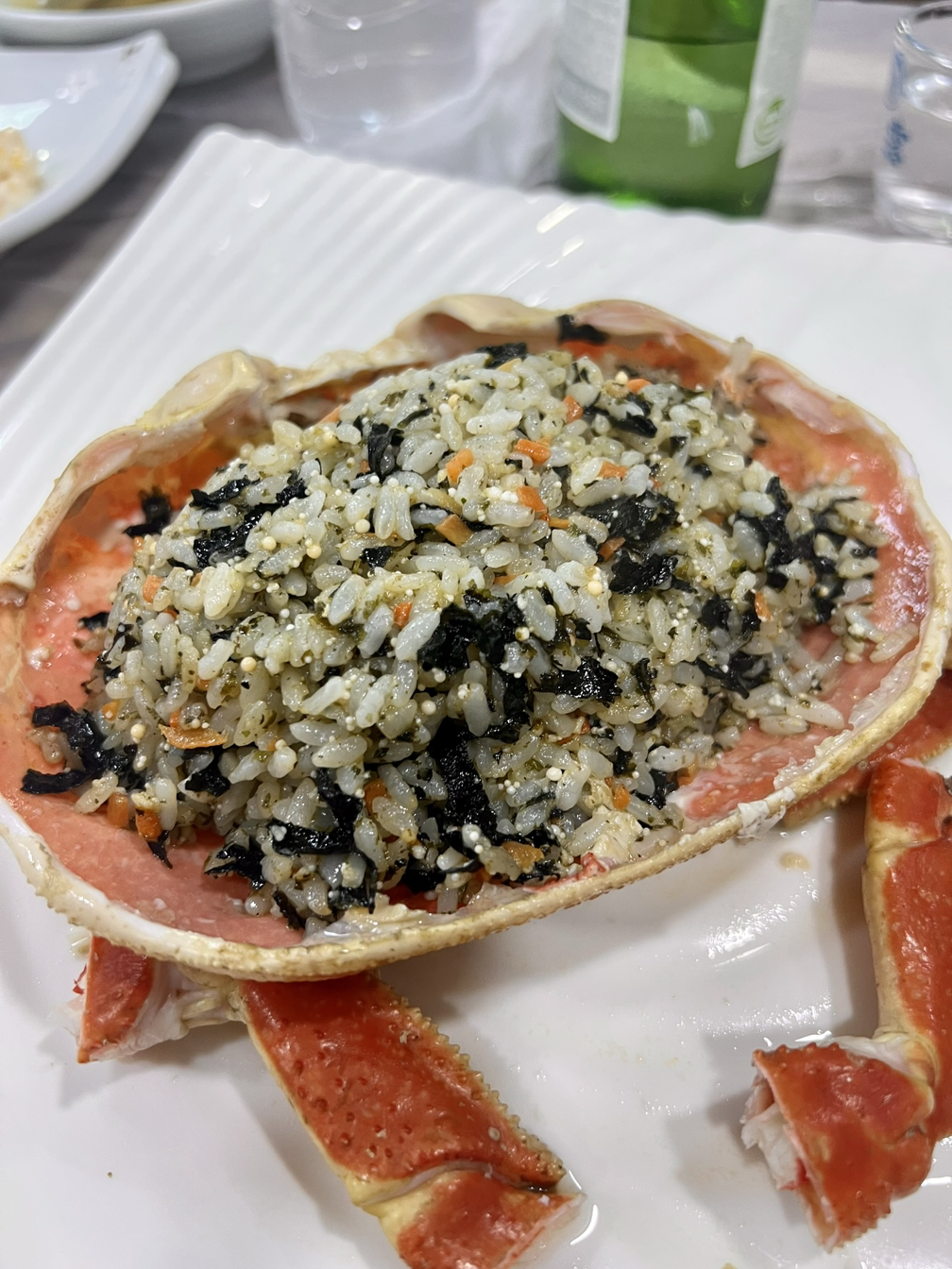 숙소에 짐을 풀자마자 곧장 밖으로 나섰다. 상 위에는 다양한 반찬들이 먼저 차려졌다. 그 사이에 싱싱한 회가 눈길을 끌었다. 곧이어 등장한 주인공, 커다란 대게는 껍질을 열자마자 살이 꽉 차 있었다. 하얀 게살이 젓가락에 한가득 집혔고, 입에 넣자 부드럽고 달큰한 맛이 입안 가득 퍼졌다. 마지막에는 게 내장에 밥을 넣고 김가루와 깨를 올려 비볐는데, 붉은 게 껍데기에 담긴 내장 비빔밥은 진한 풍미로 속초까지 온 이유를 단번에 증명해 주었다.