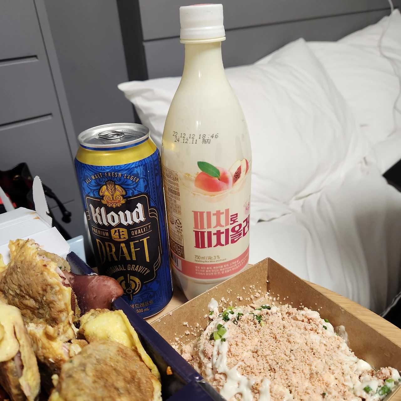 포만감을 안고 시장으로 발걸음을 옮겼다. 닭강정, 오징어순대, 바삭한 튀김까지 이것저것 집어 들다 보니 금세 상자가 가득 찼다. 숙소로 돌아와 맥주와 막걸리를 꺼내고 야식을 펼치니 본격적인 밤이 시작됐다. 캔을 따는 소리, 막걸리 뚜껑을 여는 소리가 동시에 울리고, 우리는 튀김을 집어 먹으며 맥주를 마셨다. 달콤한 피치 막걸리를 곁들이며 회사 이야기, 고민, 웃긴 썰까지 나누다 보니 시간은 훌쩍 흘러갔다. 웃다가, 진지해졌다가, 다시 웃으면서 여행의 밤은 깊어졌다.