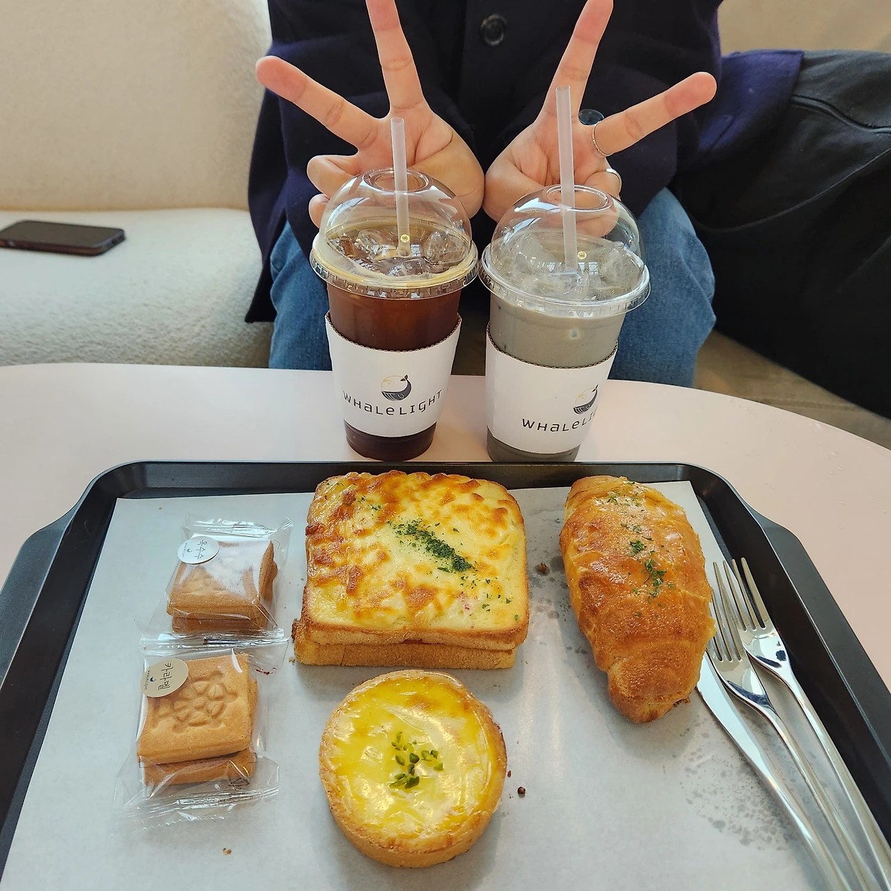 산책을 마치고 근처 카페에 들렀다. 바삭한 크루아상, 치즈 토스트, 노릇한 에그타르트가 트레이 위에 놓이고, 아이스커피와 흑임자 라떼가 함께 나왔다. 빵을 한 조각씩 나눠 먹으며 웃던 순간, 창밖의 바다는 여전히 파도치고 있었고 카페 안은 고요했다.