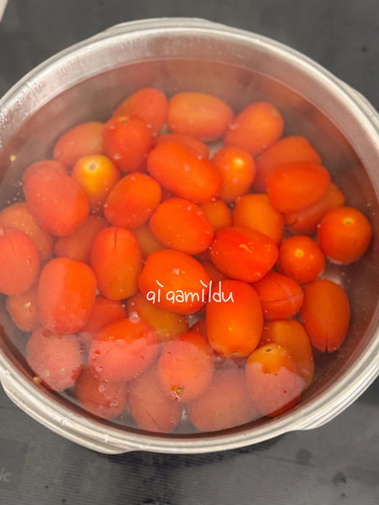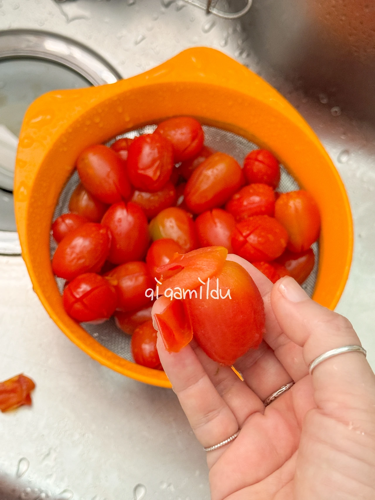 냄비에 다시 물을 담고 끓여주기 시작한다. 물이 끓기 시작하면 십자 칼깁을 낸 방울토마토를 넣고 30~40초 정도 데쳐준다.