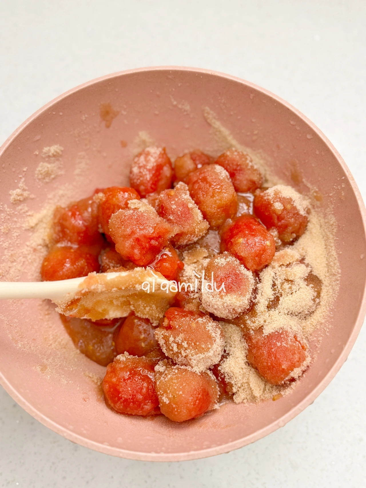 큰 볼에 껍질을 벗겨낸 방울토마토를 넣고 설탕을 넣고 섞어주면 생각보다 훨씬 더 설탕이 빨리 녹는다는 것을 볼 수 있고 토마토청이 휘리릭 완성되는 것을 확인할 수 있다.