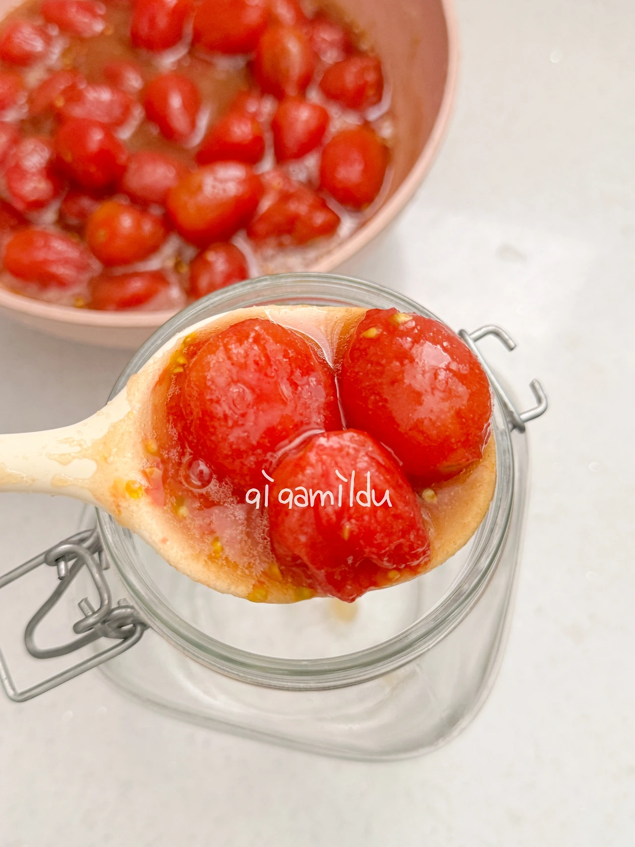 열탕소독한 병에 완성된 토마토청을 넣어주면 여름의 맛이 기다려지는 토마토청은 완성이다.