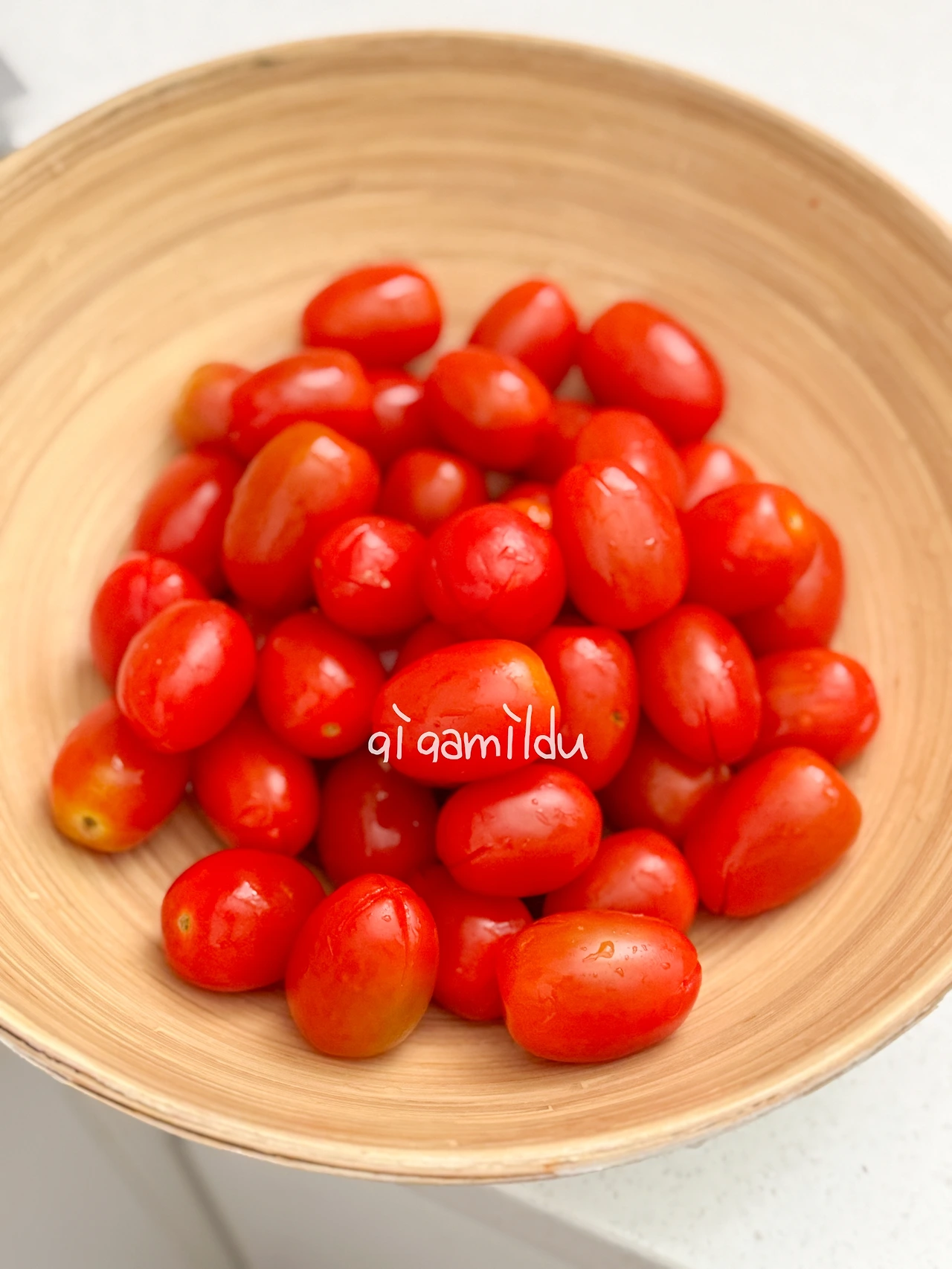 흐르는 물에 헹구어낸 방울토마토는 물기를 살짝이 건조 시켜 준 후에 꼭지를 떼고(토마토를 상하게 하는 부분은 꼭지 부분이기 때문에 꼭지는 되도록이면 빨리 제거해 주는 것이 좋다고 한다) 꼭지 반대편 동그란 부분에 십자 칼집을 내 주었다. 칼집을 내 준 이유는 뜨거울 물에 데쳐낸 토마토의 껍질을 조금 더 잘 까주기 위해서이다.