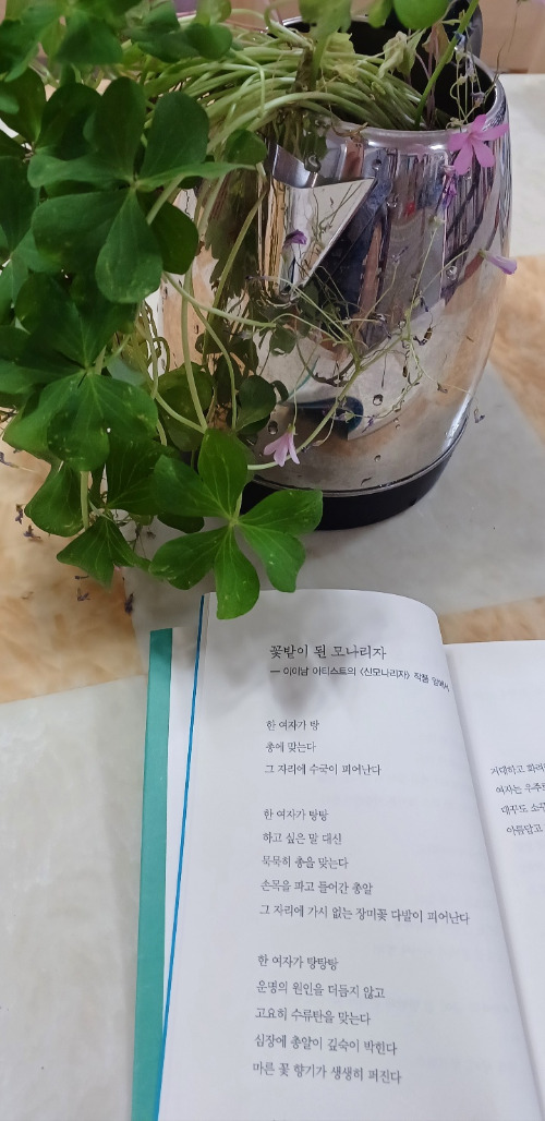 모나리자는 순식간에 온몸에 총탄과 수류탄 공격을 받아 폐허가 되었다. 그런데 순식간에 모나리자의 폐허는 꽃으로 피어났다. 총알을 맞은 부위는 작은 꽃으로 수류탄 공격을 받은 부위는 큰 꽃으로 피어났다. 모나리자는 무기의 공격을 받는 사람이 아니라 마치 세례를 받은 비둘기 같았다. 이 장면을 보며 나의 눈에서 눈물이 쏟아졌다. 가슴에서 뜨거운 샘물이 솟아나는 시원함이 느껴졌다. 내가 울고 있었다. 세 번째 놀람은 '폐허 속 꽃이 된 모나리자' 앞에서 꾸역꾸역 울고 있는 내 모습을 내가 관찰했다. 시 쓰기를 즐기는 나는 '폐허 속 꽃이 된 모나리자'라는 한 편의 시를 마음속에 심으며 힘차게 눈물을 닦았다. 그 당시 나는 본연의 나를 지키며 웃음으로 치장하는 삶에 지쳐있었다. 이런 나에게 '신 모나리자'는 총알과 수류탄을 맞는 그 상황을 폐허라 하지 않고, 만개한 꽃밭이라는 메시지를 전달했다. 꽃밭으로 만개한 '신 모나리자'는 그 정신을 모방하며 살아가고픈 창조의 에너지를 선사했다.