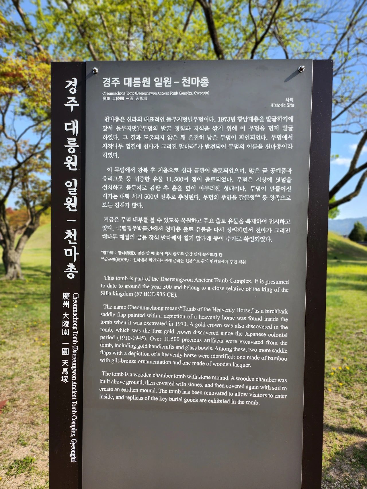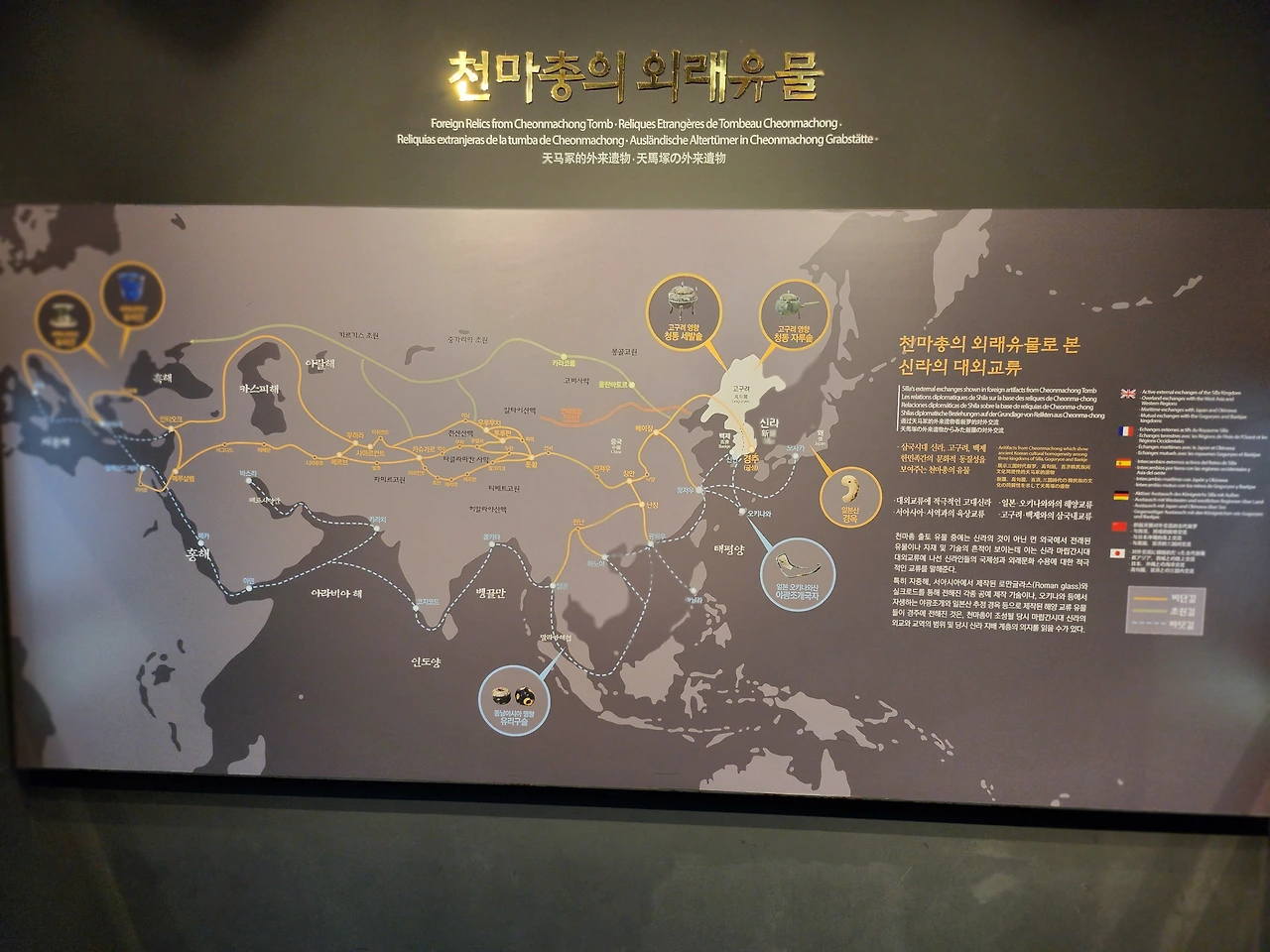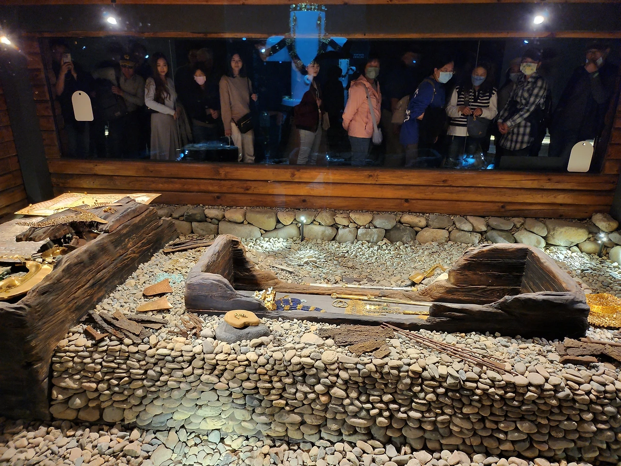 천마총에 들어가니 발굴 당시의 무덤과 그 속에서 나온 유물들이 전시되어 있었다. 중앙아시아를 말달리며 살아온 흉노족들이 서쪽으로는 튀르키예까지 가고 동쪽으로는 신라까지 와서 정착한 흔적들이 남아있었다. 화려한 금관과 금 세공품들은 이동하며 보관하기 쉬운 유목민족들의 재산이기에 대단히 화려한 모습이었다.