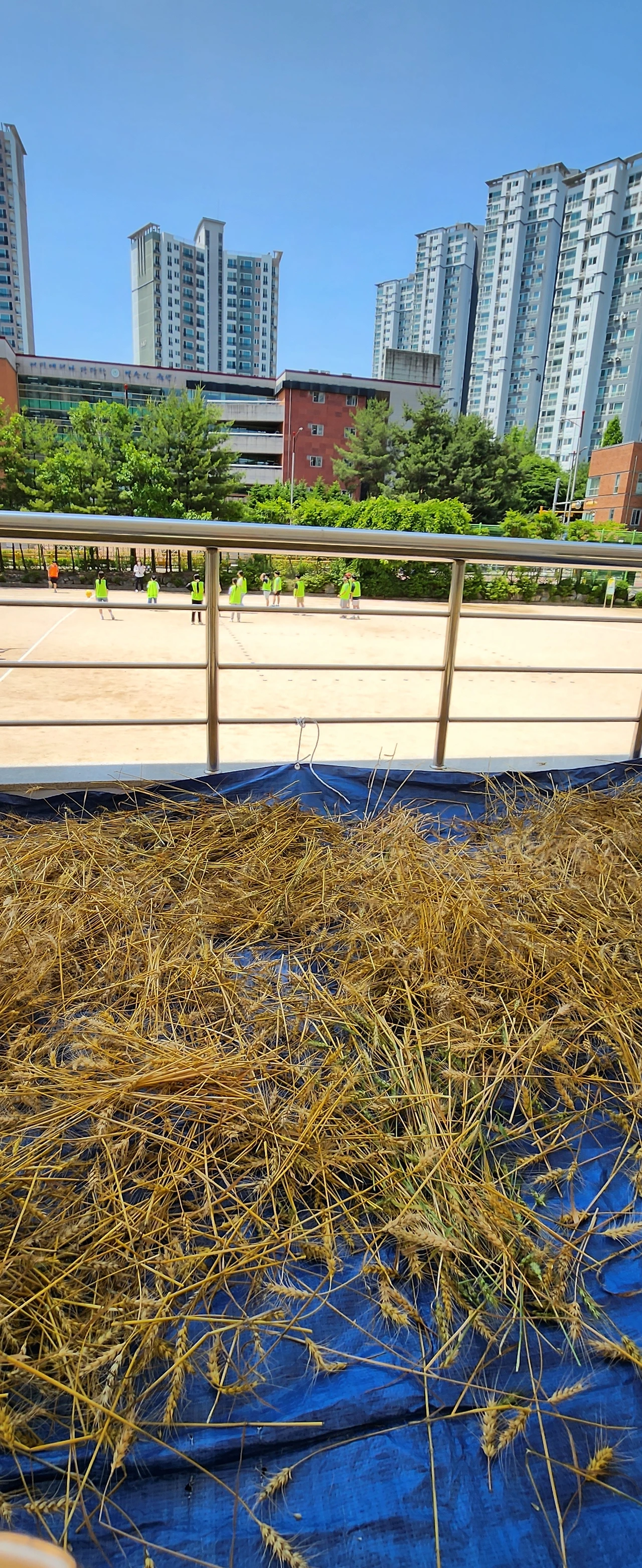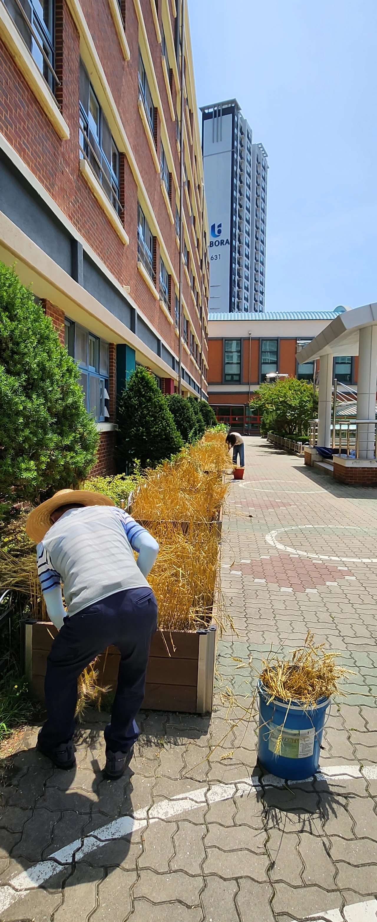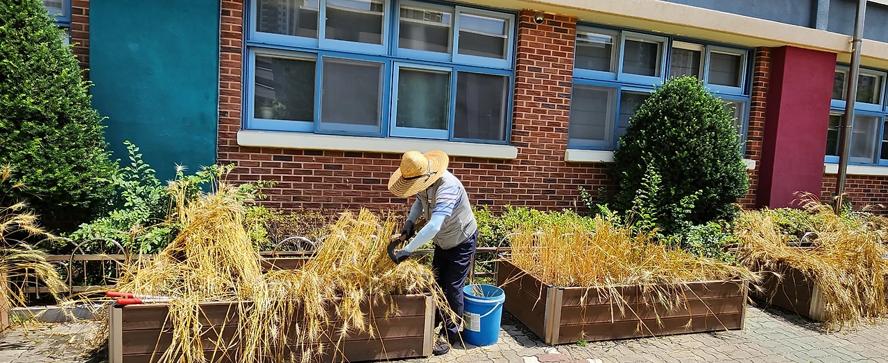 아이들이 수업하는 시간에 그동안 익은 우리 밀을 수확합니다. 잘 마르면 아이들이 우리 밀을 직접 관찰하게 하려고 합니다. 벌써 화단에는 백합꽃과 해바라기가 옥수수와 잘 크고 있습니다.