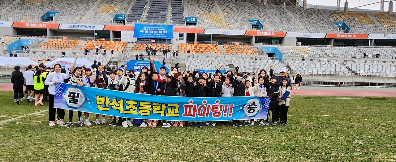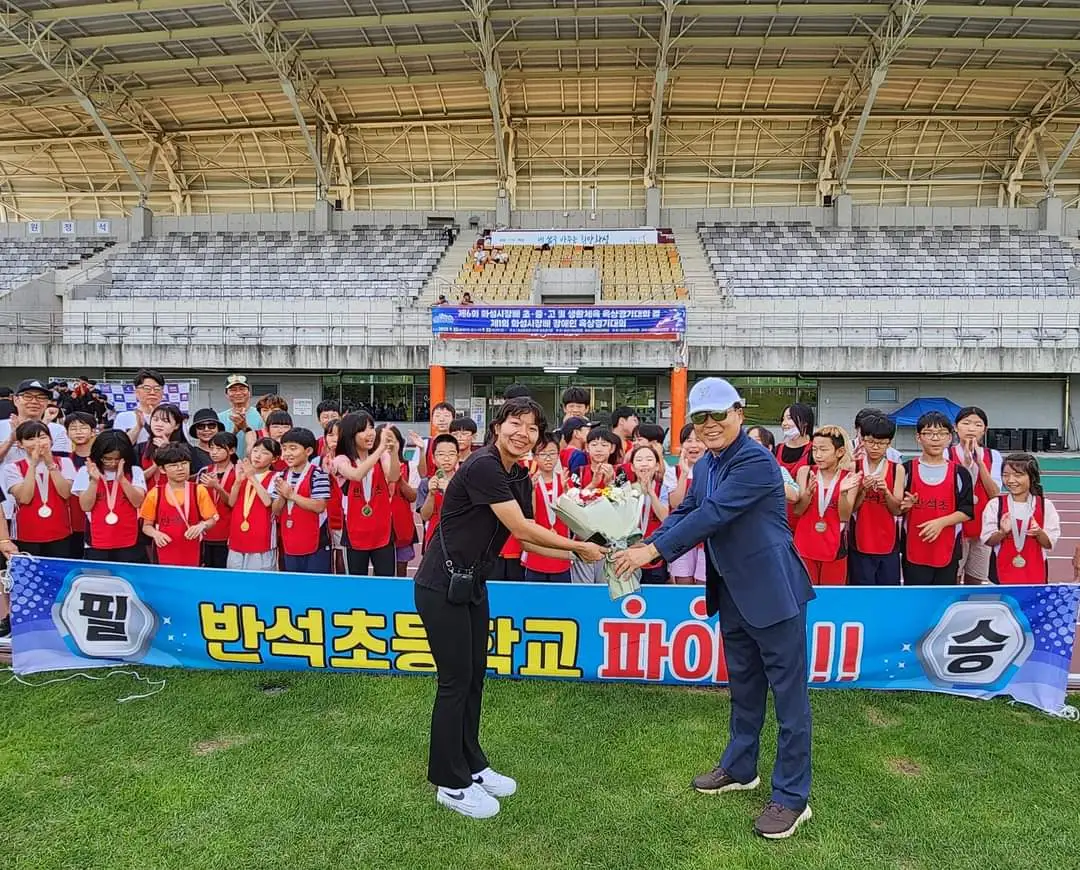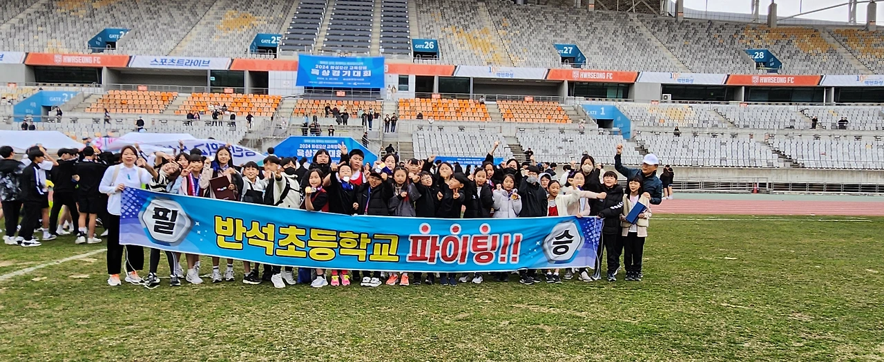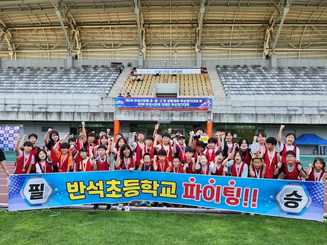 우리 반석초 육상부도 35명이 전종목에 참여하였다. 작년에 창단한 신생 육상부이다. 요즘 많은 학교 관리자들이 기존의 운동부 해체에 몰두하는 것에 반해 나는 다른 생각으로 접근했다. 학생들이 건강하게 자라나려면 기초와 기본을 다지고 체력을 길러야 한다는 것이다. 그래서 공부 못지않게 운동도 열심히 하는 반석인이 되라고 육상부를 창단했다. 시흥, 안산 교사시절부터 근무하는 학교에서 반석초까지 네 번의 육상부를 창단했다. 화성시청에서 육상부코치도 지원해 주었고 올해에는 교육청에서 스포츠강사도 배정받아서 체육교과에 협력수업이 가능해졌다.
