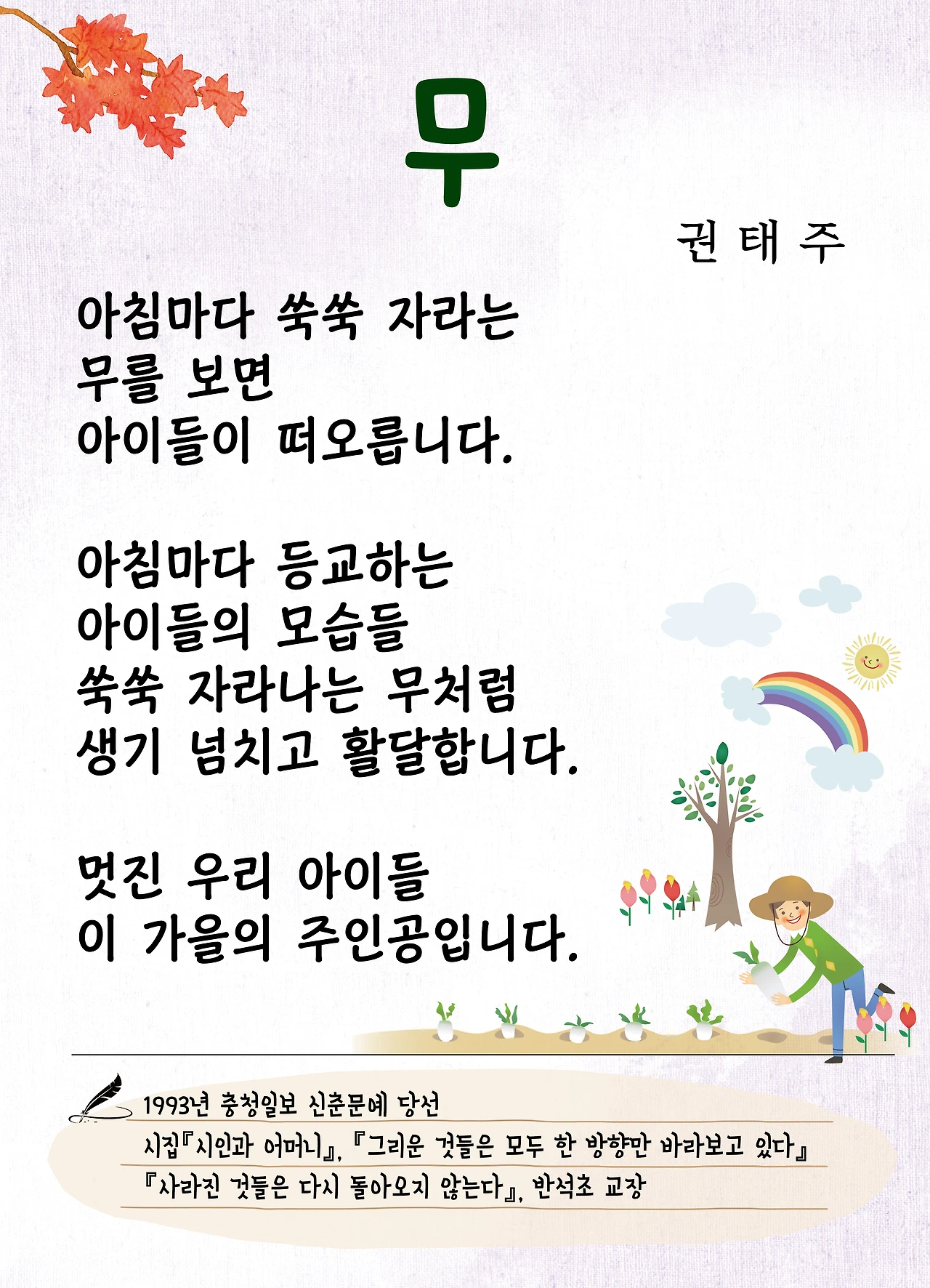 빨간 컨테이너 농장에서 작년 여름인가, 이00 수암봉문학회 회장 등 지금의 수암봉 동인이 된 회원들과 함께 이름 모를 채소류 모종을 하던 추억의 한 장면이 드론 항공 사진같이 이번 권태주 시인 농부의 사진을 통해서 VR 증강현실로 떠오릅니다. 대부도 바닷가 먼 파도 소리와 함께 네덜란드 시골 마을 같은 빨간 지붕이 생각납니다. 그때 현모양처형 교감 사모님이 우리에게 대부도 특산물 바지락 칼국수도 맛보게 해주었지요. 이렇게 우리 문우들은 어느덧 만주벌판 광복군 동지들같이 문학에 목숨 건 3년 차 끈끈한 수암봉 동인으로 거듭나게 되었습니다.