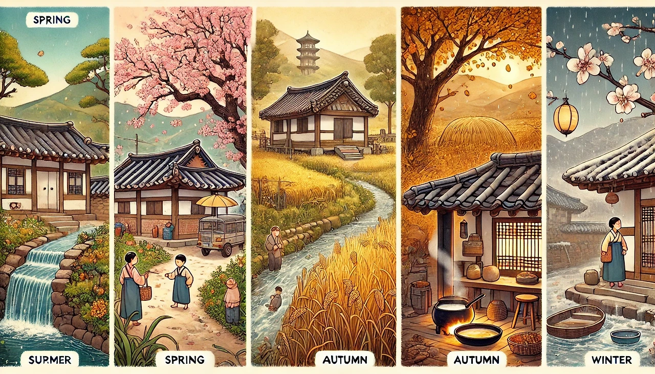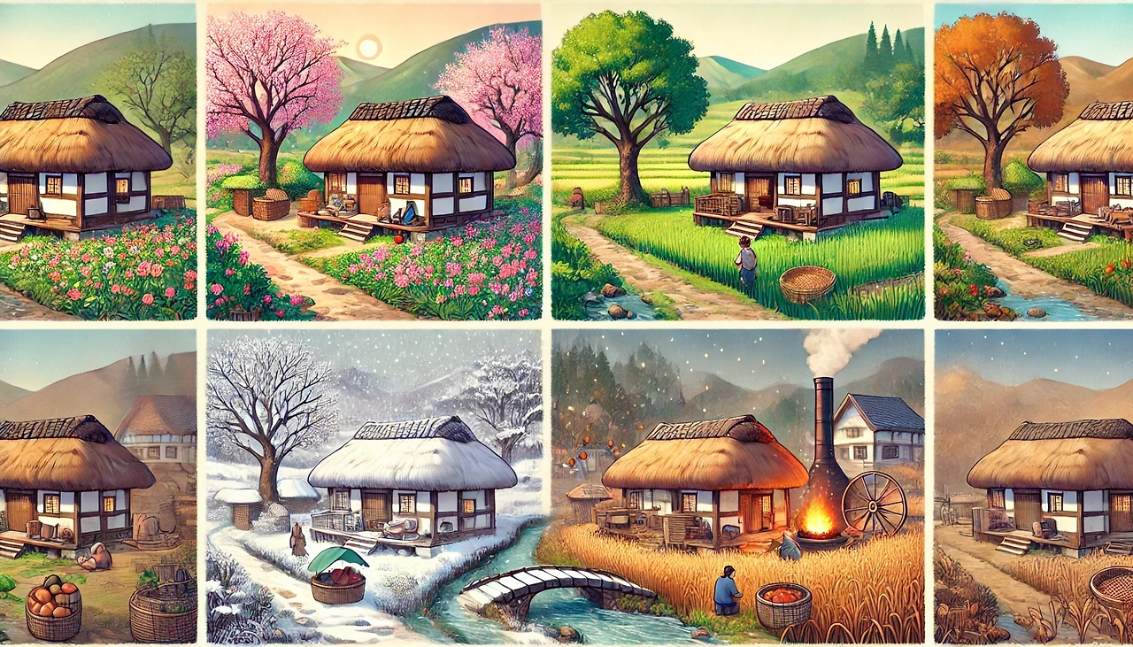 초가지붕 아래 벚꽃이 춤춘다