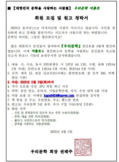 많은 대한민국 문인들이 참여하여『우리문학』창간호를 3월에 발간하였습니다. 이에 여름호를 발간하고자 문학을 사랑하는 문인들의 옥고를 싣고자 하오니 기일내 보내주시면 감사하겠습니다.