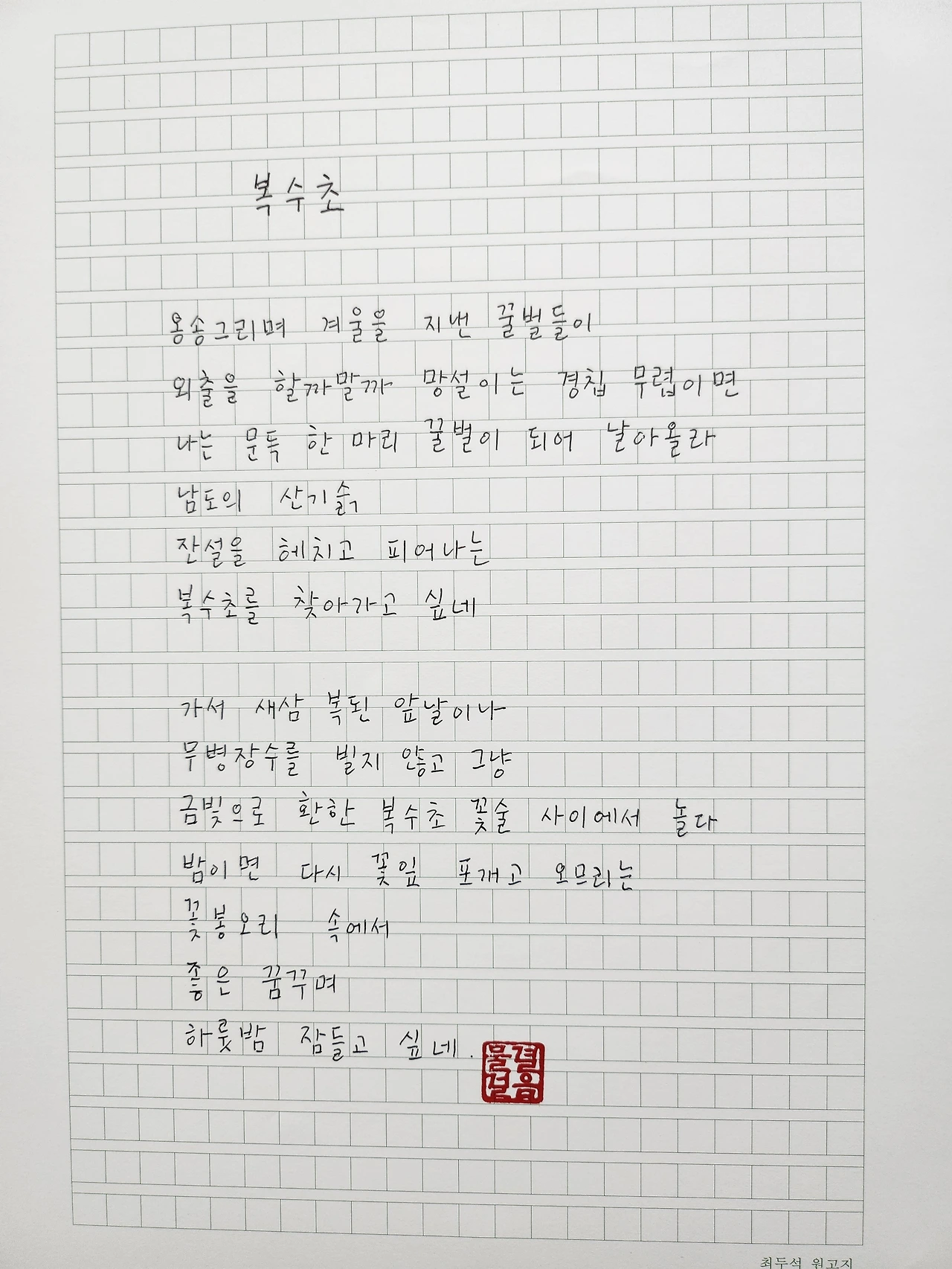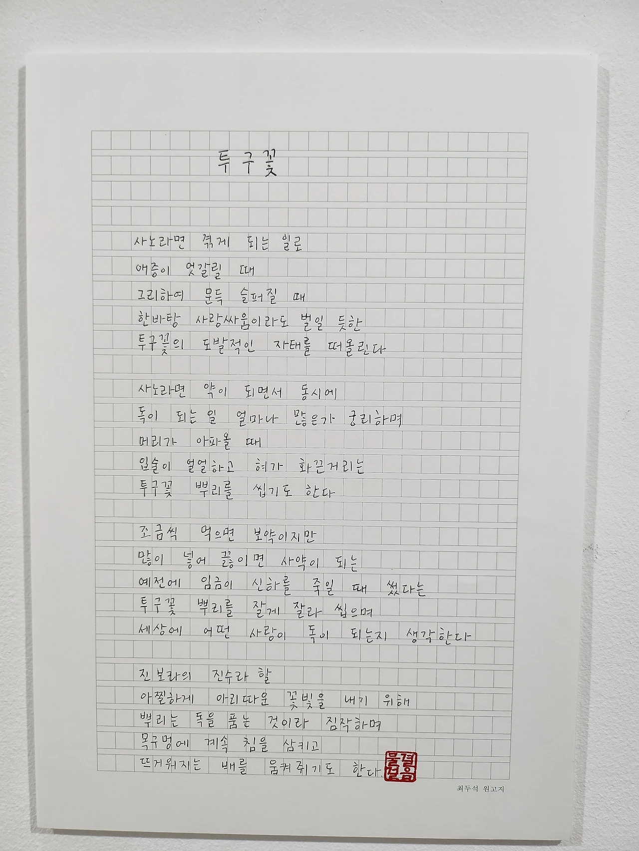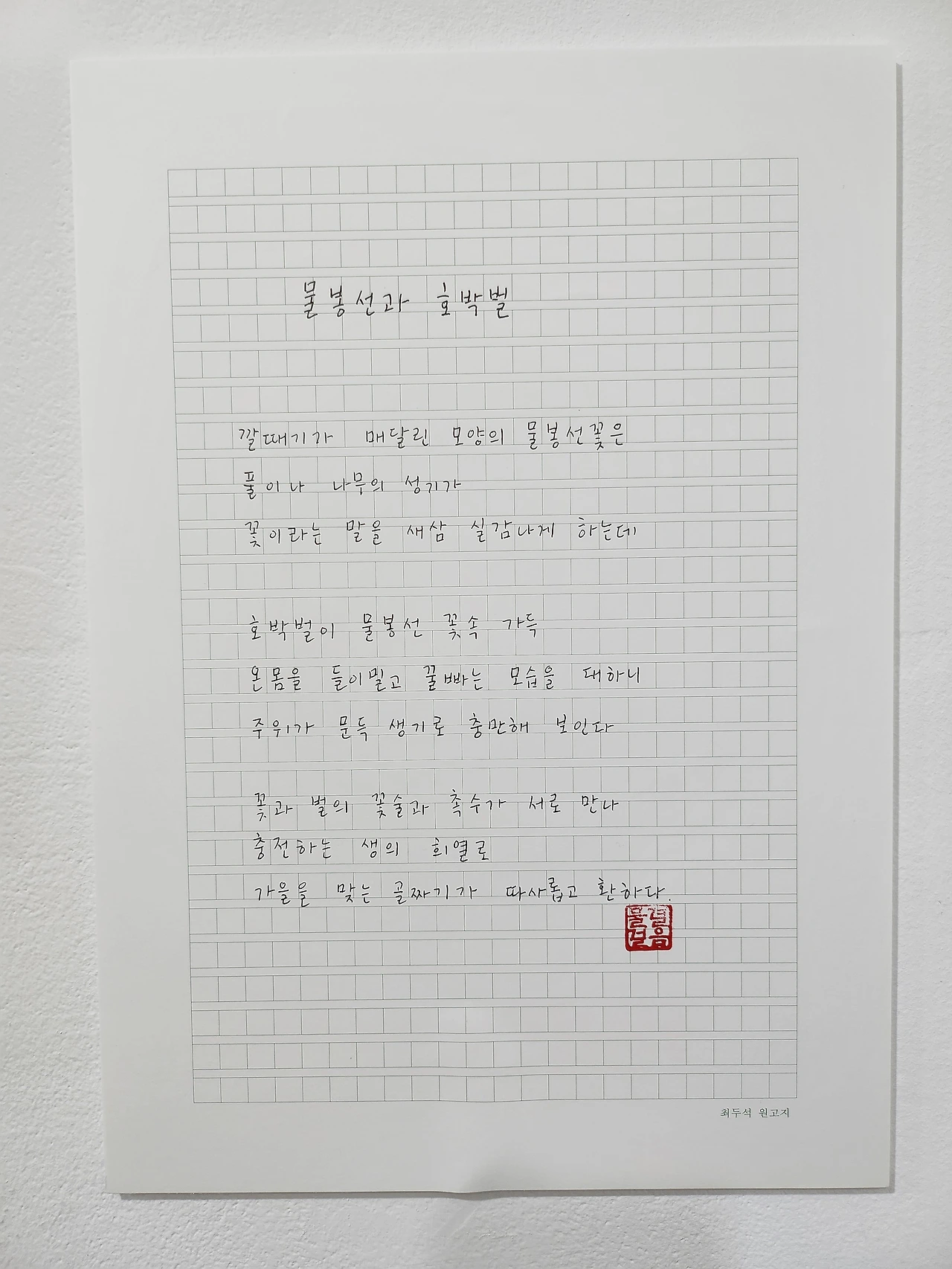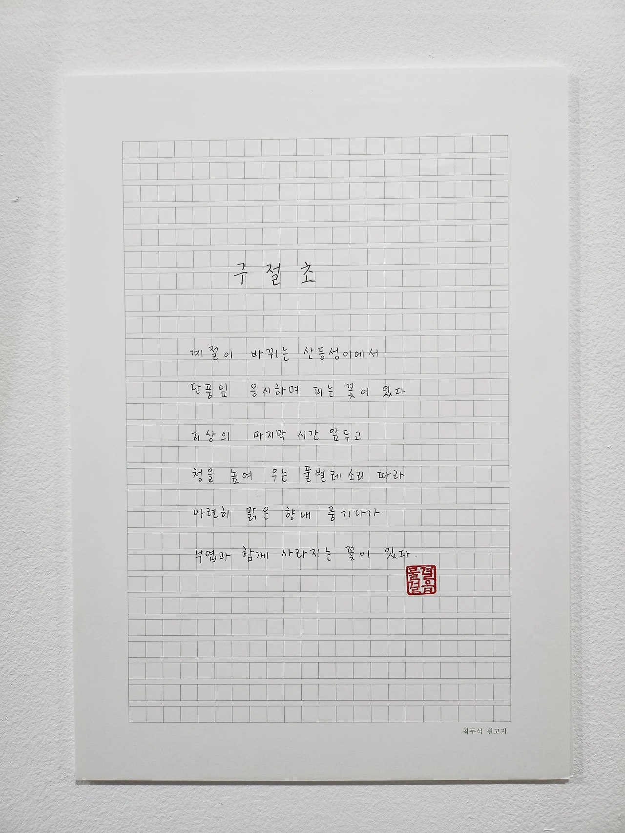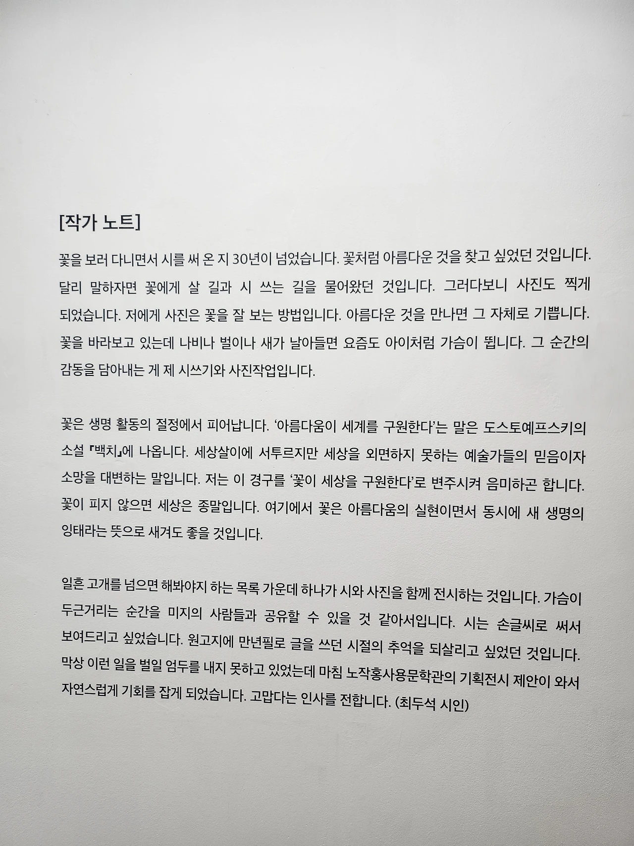 어제는 홍사용문학관에서 한신대 문예창작과 명에교수이며 시인이신 최두석 시인의 시사진전이 열렸다. 30년 동안 찍은 사진에 육필 시를 발표하셨다. 문학과지성사에서 많은 시집을 낸 시인으로서 작품의 수준이 매우 높았다.